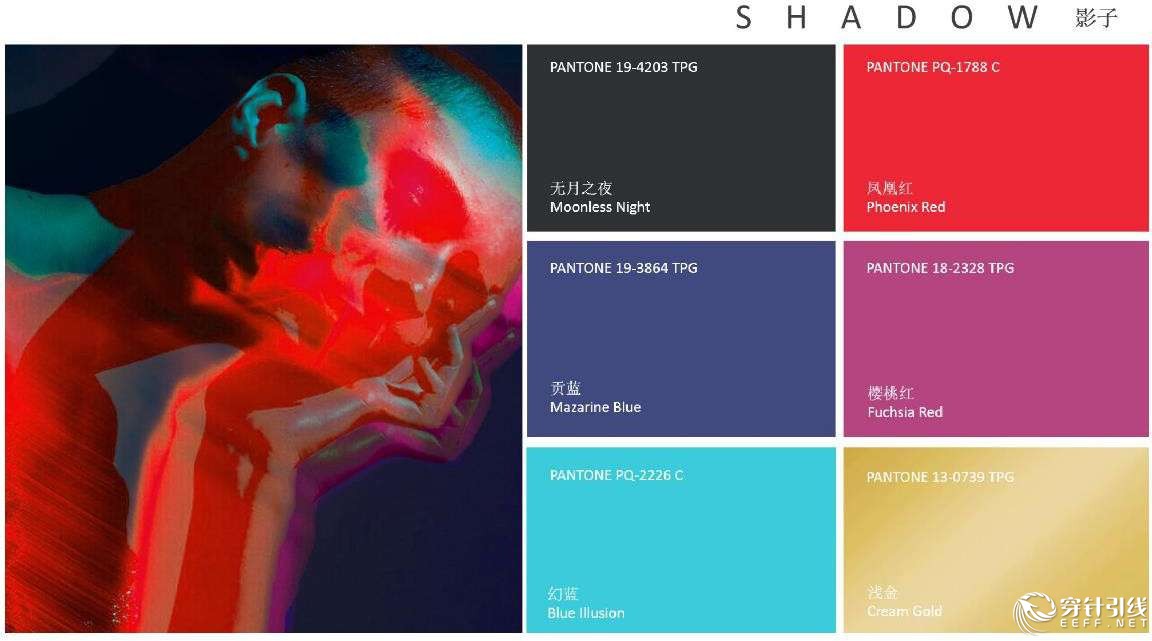 “未知”主題下的色組以無月之夜,貢藍等幽暗色系為主基調,仿佛被封禁于一個幽暗的空間中,微弱燈光投影出的影子虛無縹緲,暗示著一切都是未知。鳳凰紅象征從熊熊魔火中涅槃重生,消極悲觀中透著希望。摩登淺金和前衛的幻藍色起到整體提亮作用。自然超現實的色彩與高飽和高明度的人工合成色(鳳凰紅、幻藍色)搭配形式,擴大表達的張力, 整組色彩將這種沒有硝煙卻關乎生死的氣氛完美烘托出來。