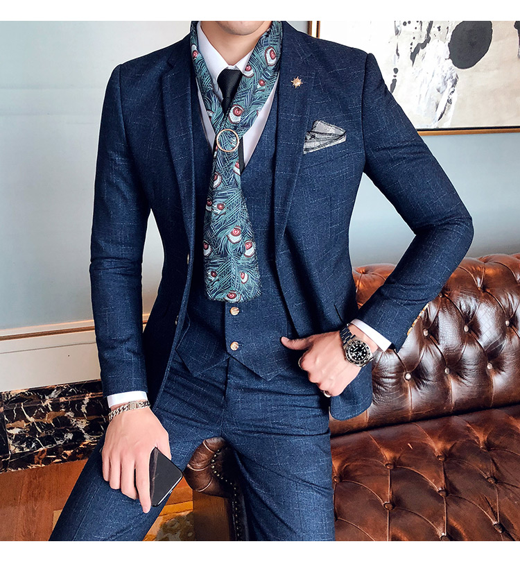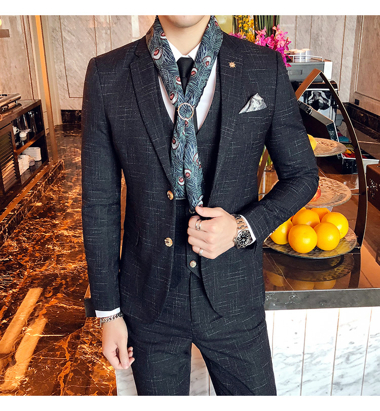 春夏季新款竹節(jié)暗紋男士西裝雙扣帥氣西服韓版潮流修身氣質(zhì)三件套