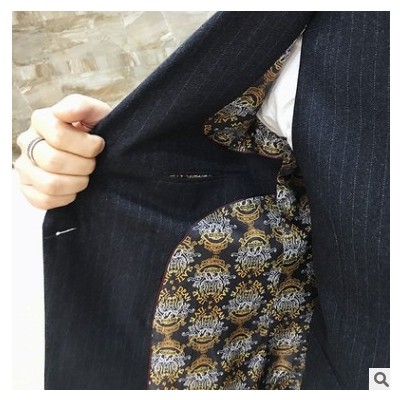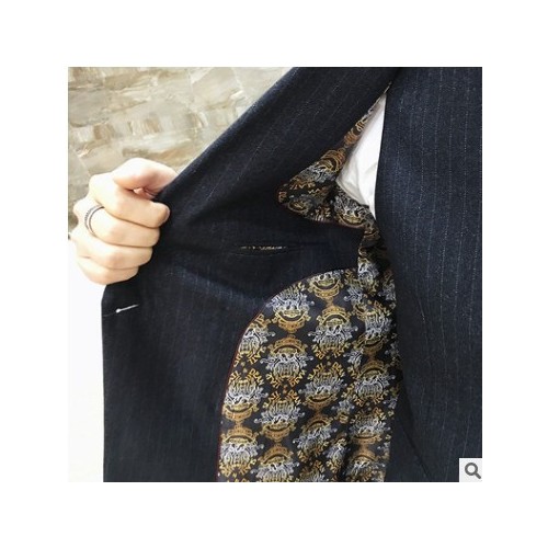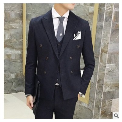 新款韓版修身商務新郎雙排扣條紋西裝三件套藏藍色翻領潮男