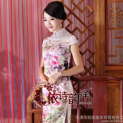 春裝新品重磅真絲旗袍改良修身短款開叉 真絲牡丹花旗袍桑蠶絲