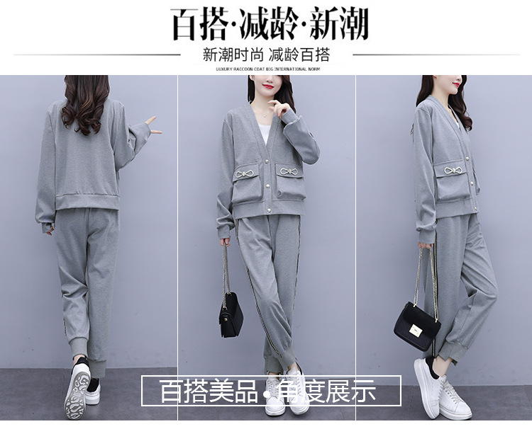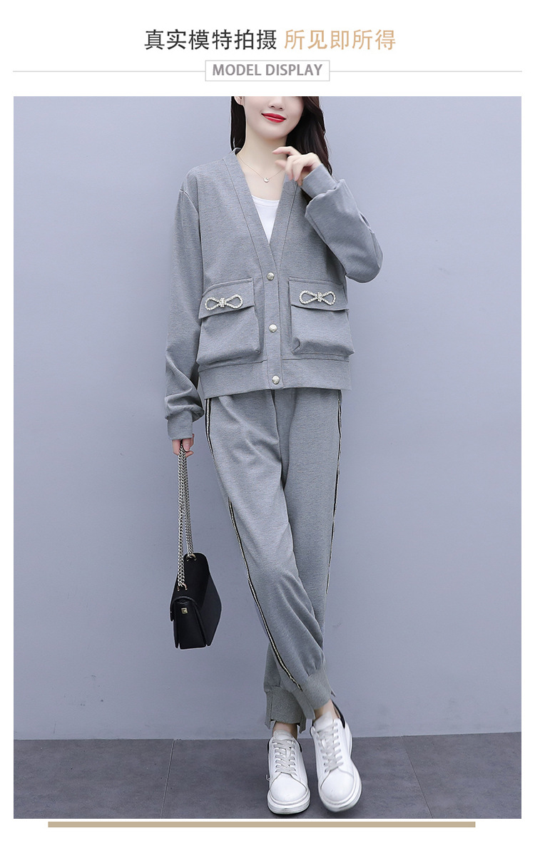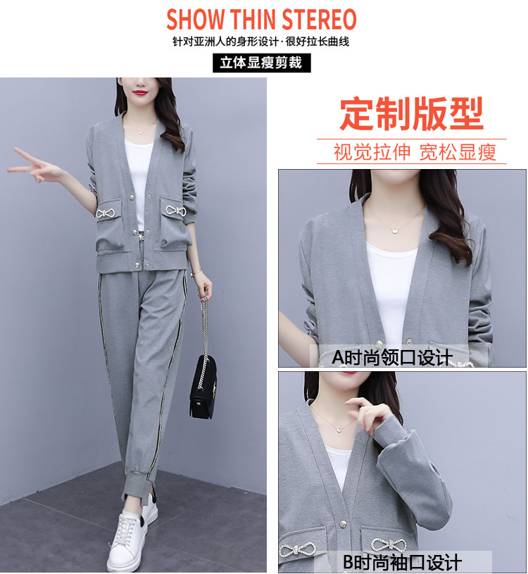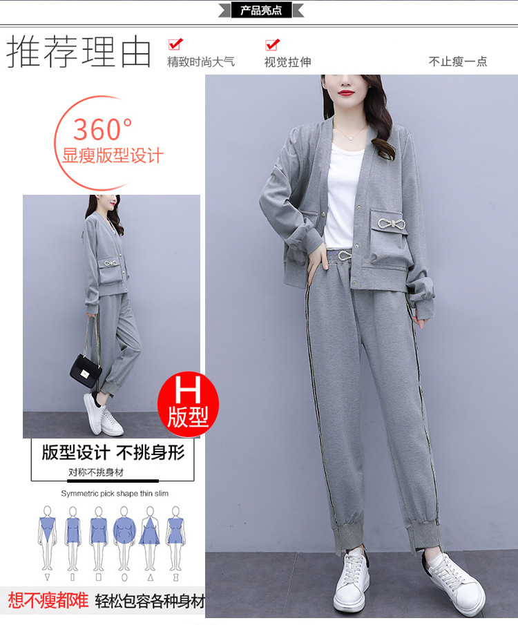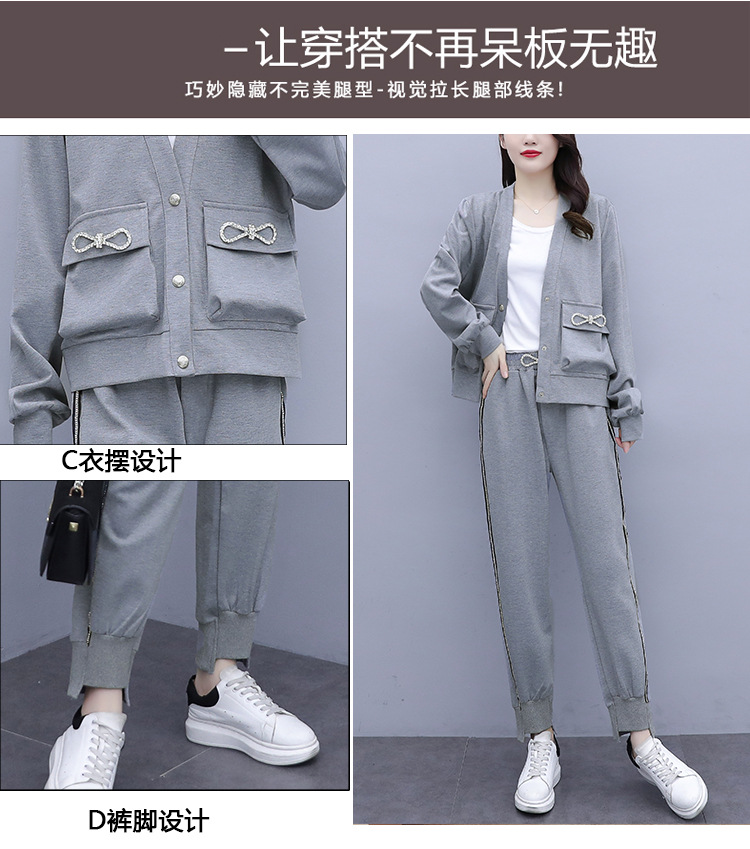 2021春秋新款大碼套裝女單排扣鑲鉆蝴蝶結V領外套束腳褲兩件套