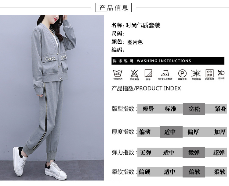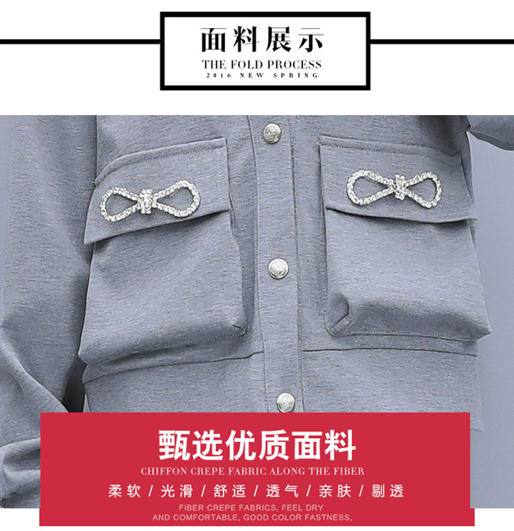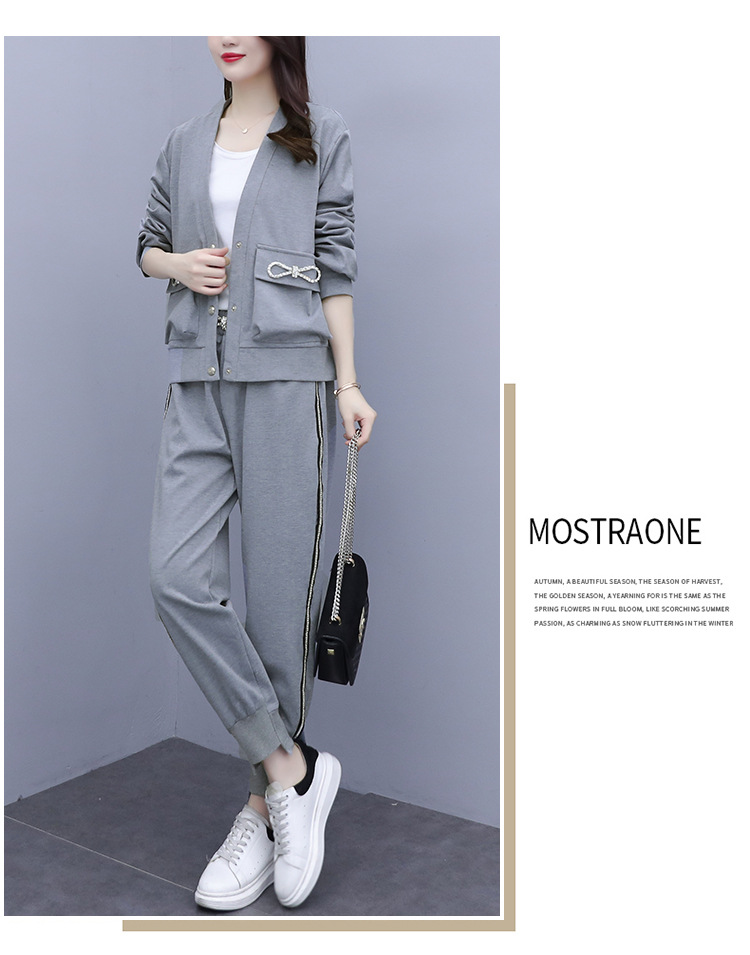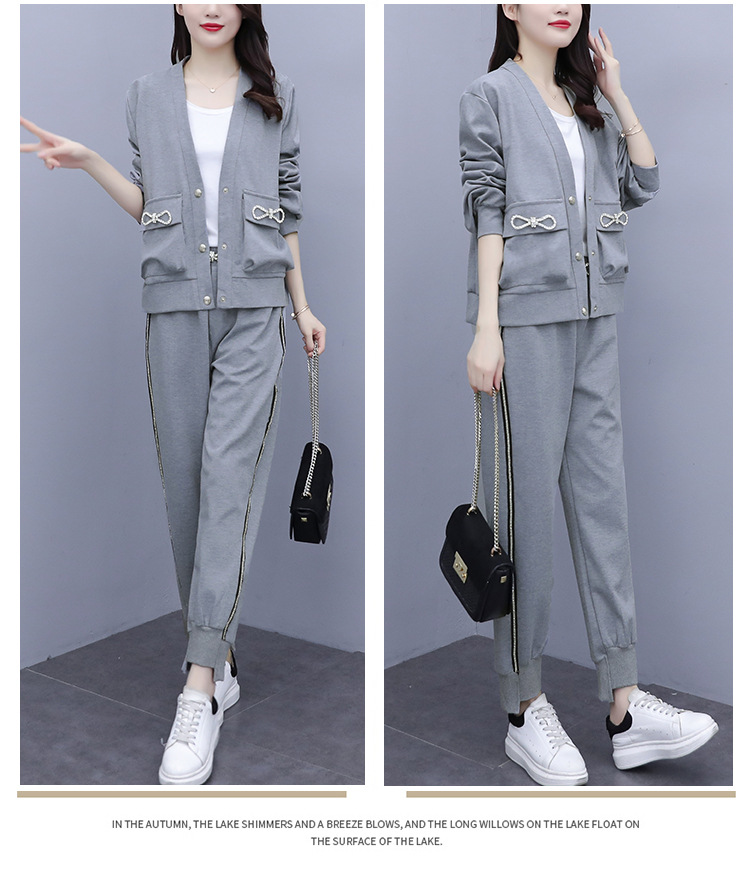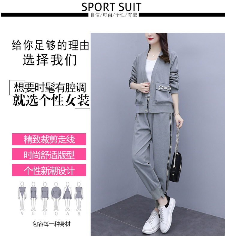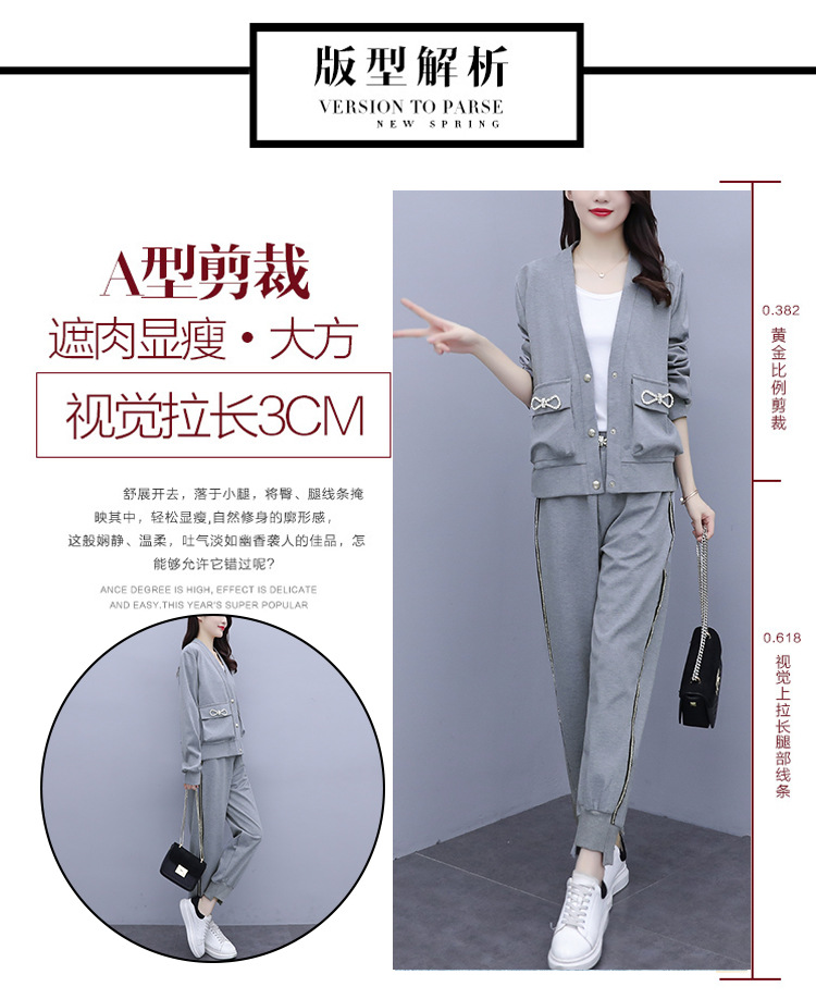 2021春秋新款大碼套裝女單排扣鑲鉆蝴蝶結V領外套束腳褲兩件套