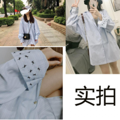 楊冪機場同款淺藍色條紋長袖襯衫女寬松螞蟻刺繡花中長款襯衣