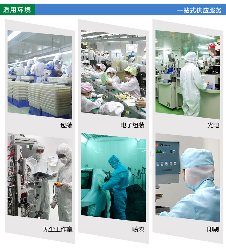 也可按客戶要求訂制其他顏色和款式,產品可滿足100級至10萬級無塵室需求。廣泛應用于電子、半導體、光纖通訊、精密機械、食品加工等行業,亦符合生物與制藥企業GMP認證的要求。