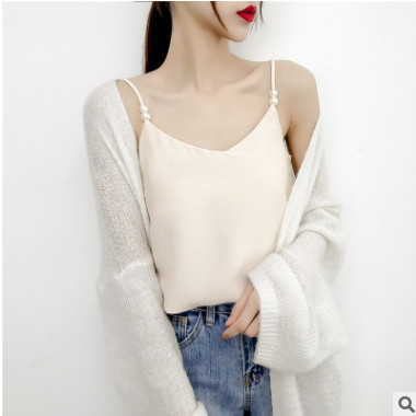 韓國東大門2019珍珠肩帶打底吊帶背心女裝 夏季性感v領小心機