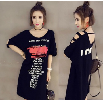 加肥加大碼女裝胖mm中長款連衣裙200斤胖妹妹印花鏤空露肩寬松t恤