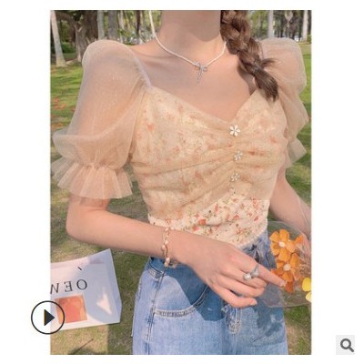 莫奈小衫雪紡衫女短袖2021夏季新款洋氣甜系網紗碎花上衣潮流