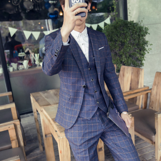 男式格子西服套裝男士新郎結婚禮服修身伴郎服英倫西裝定制批發