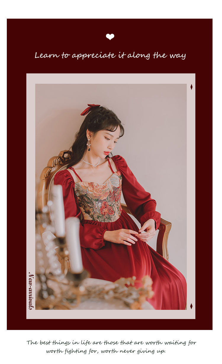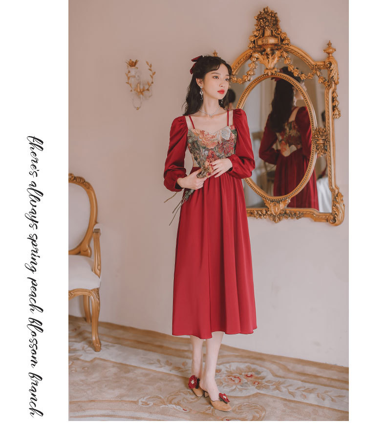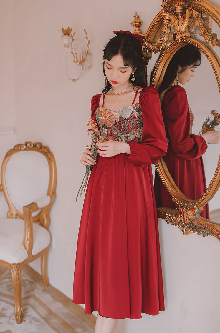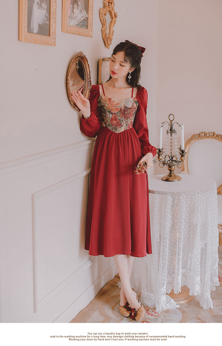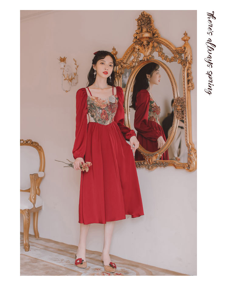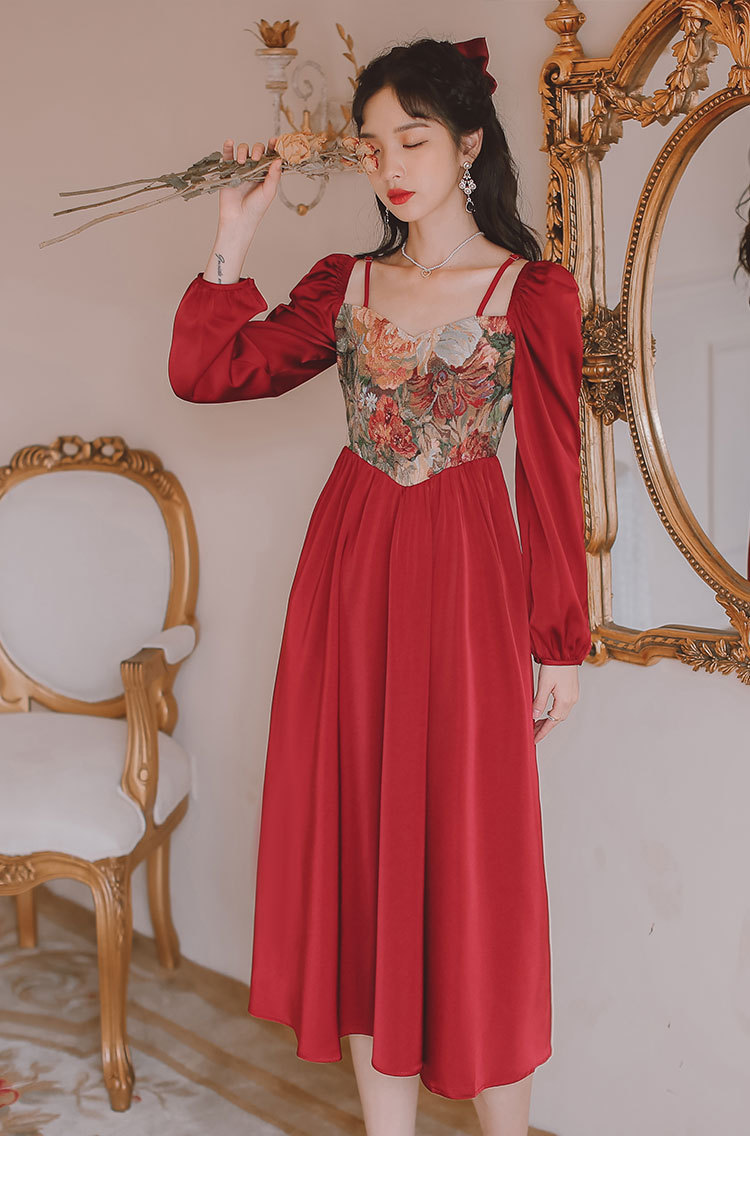 2020秋冬新款茶歇法式紅色連衣裙女設計感油畫感宮廷風復古裙子