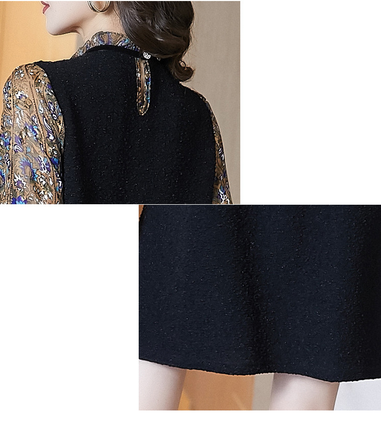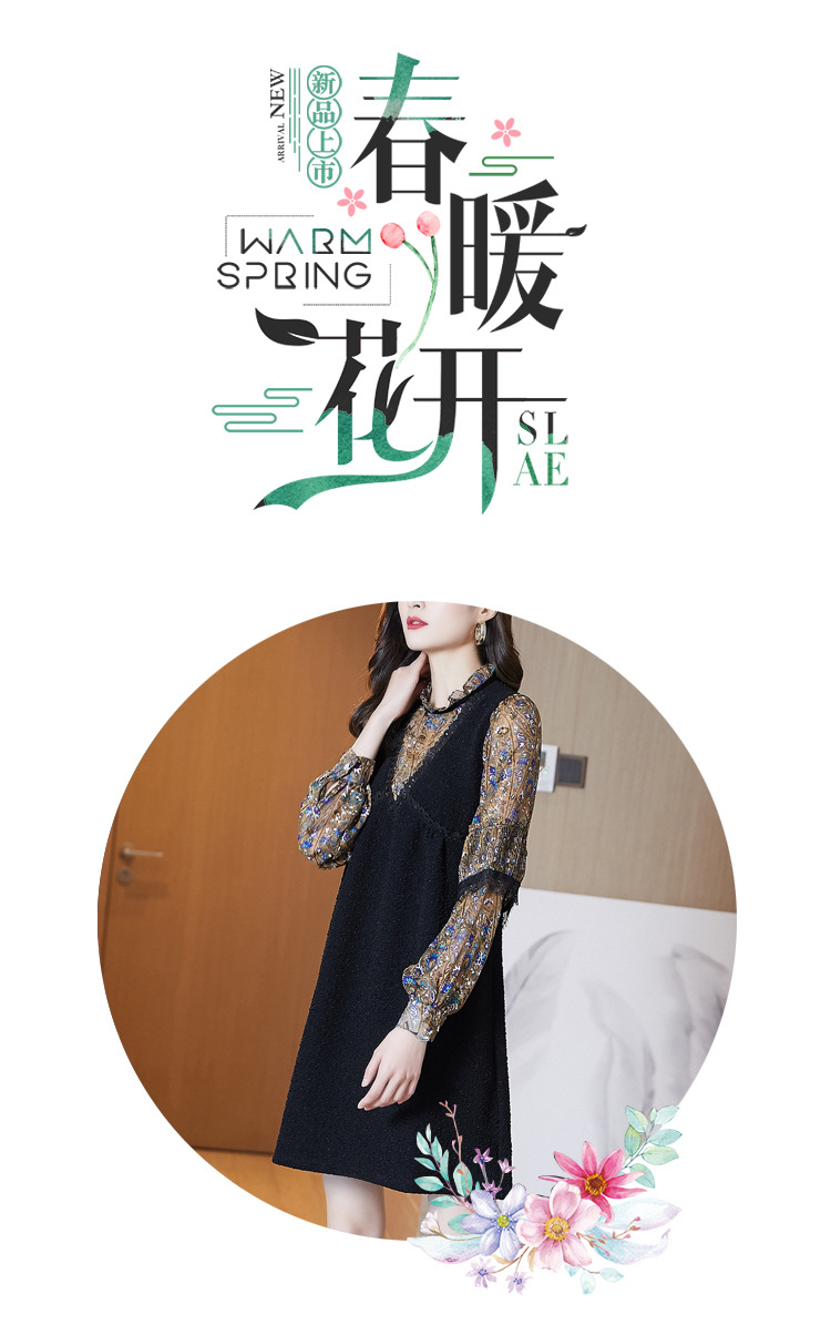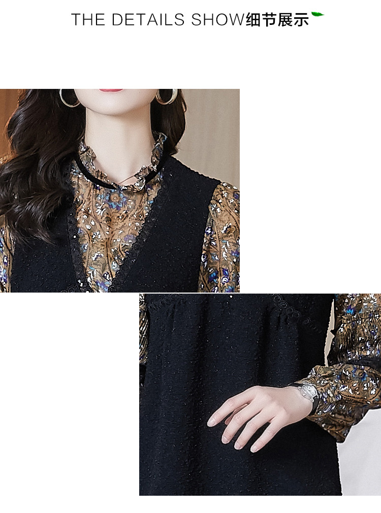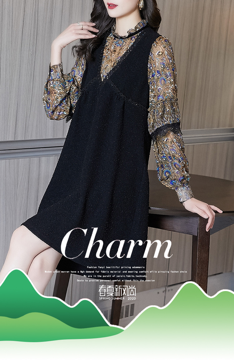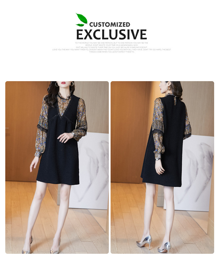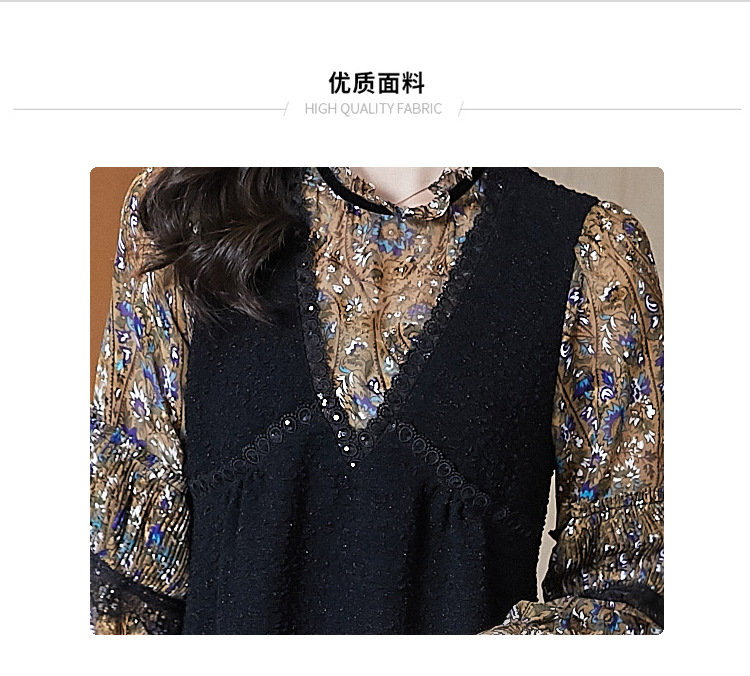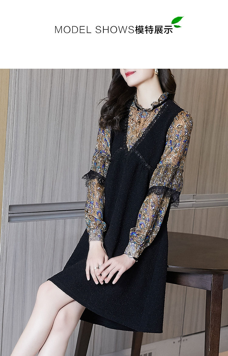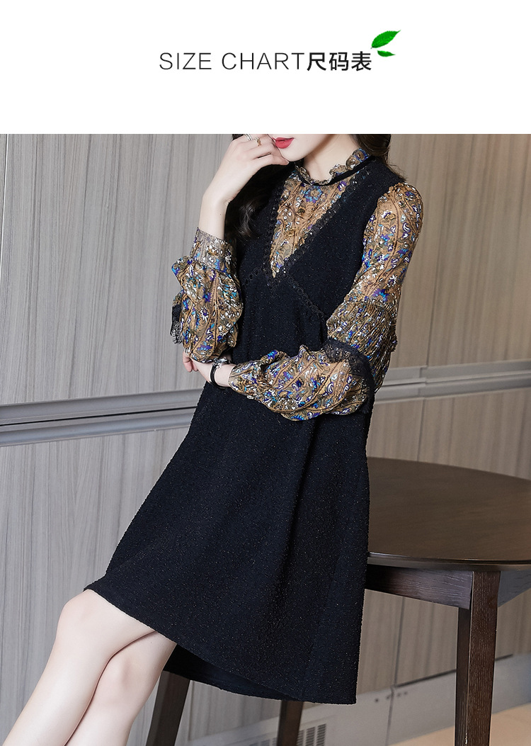 2021年春款女裝法式a字大碼胖mm荷葉邊碎花針織假兩件拼接連衣裙