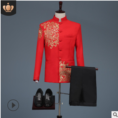 2019新款男士繡花中山裝中式青年唐裝秀禾服舞臺主持人司儀演出服