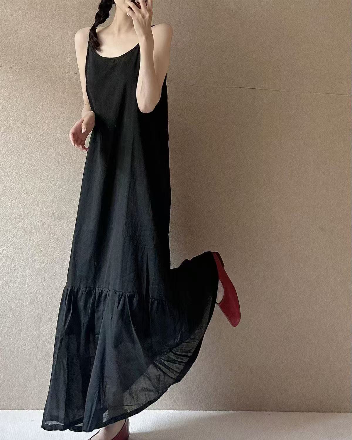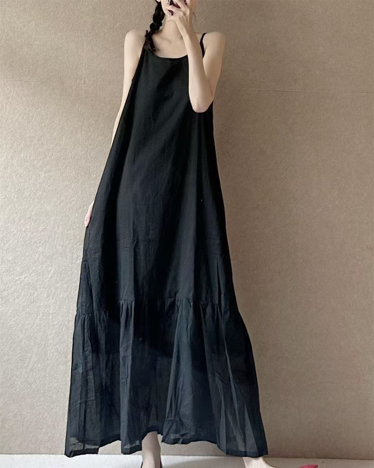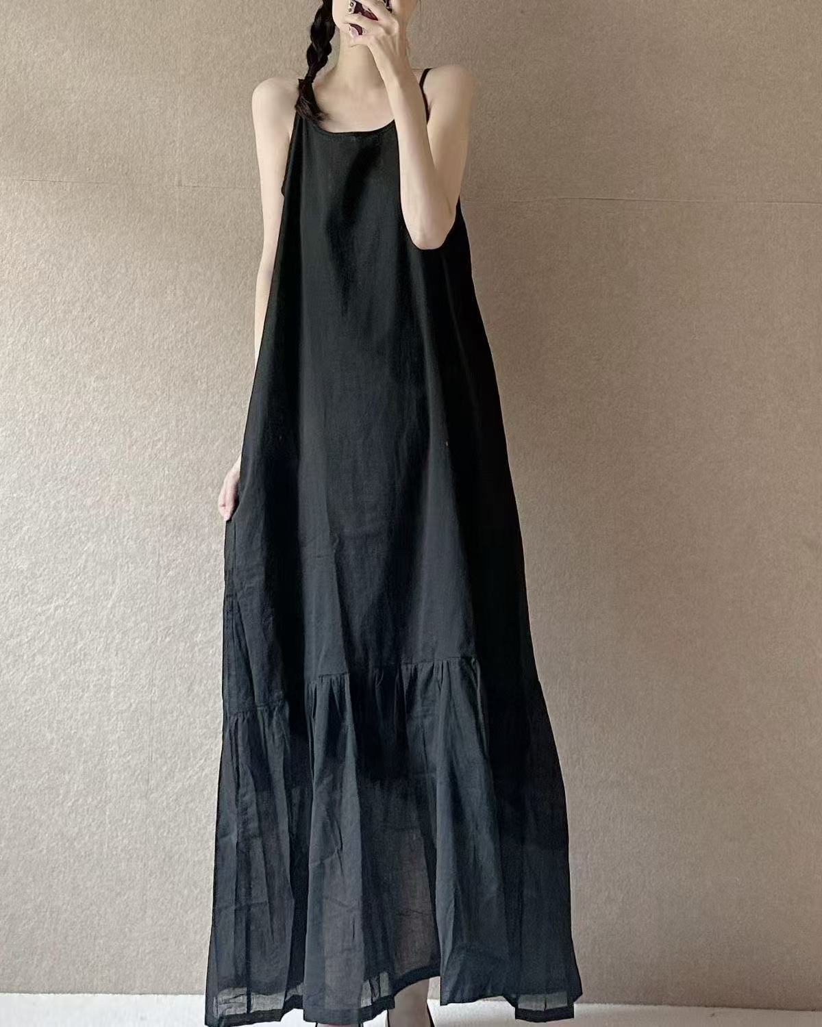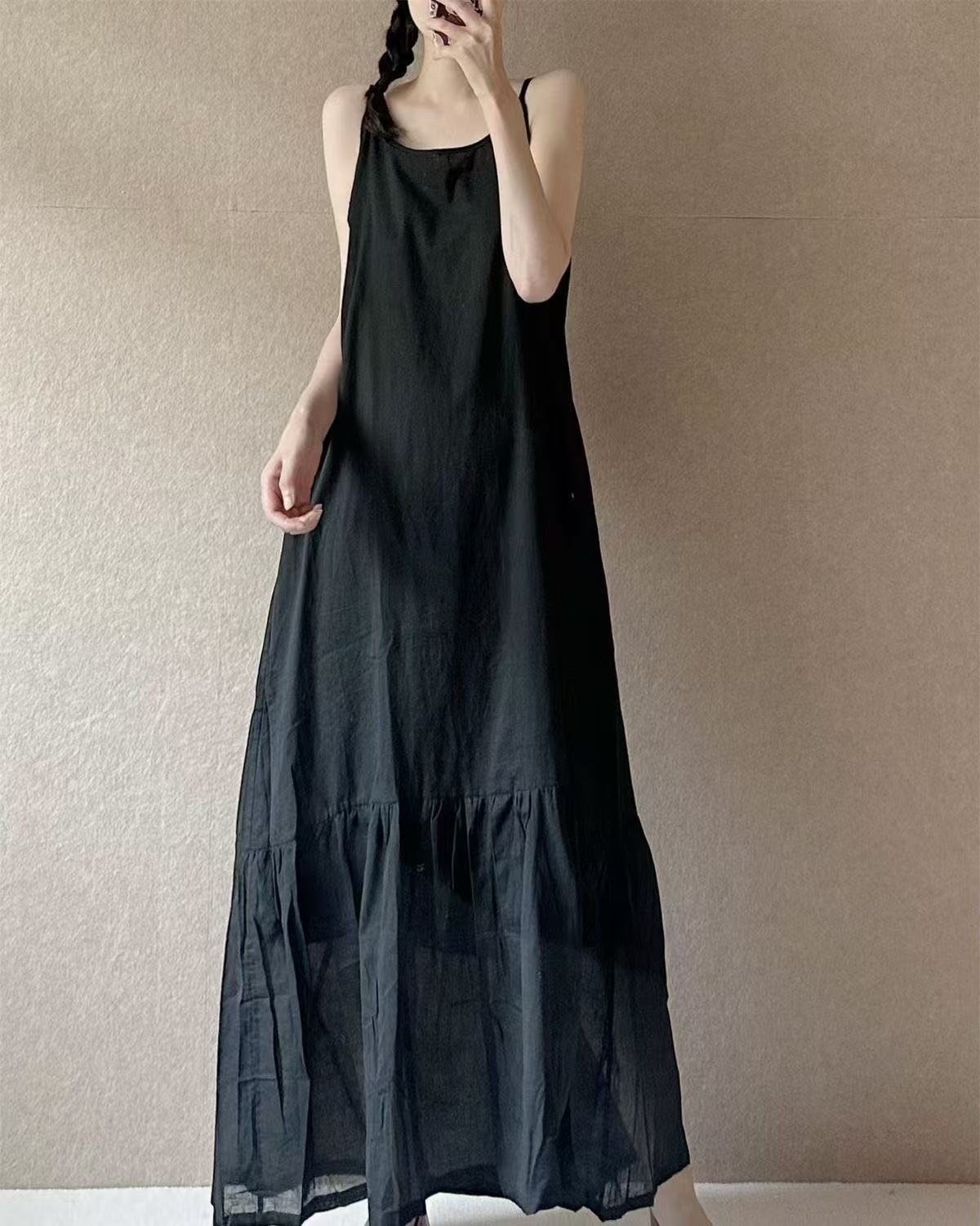 棉麻純色連衣裙簡約拼接吊帶裙2025夏季氣質女裝新款寬松文藝長裙