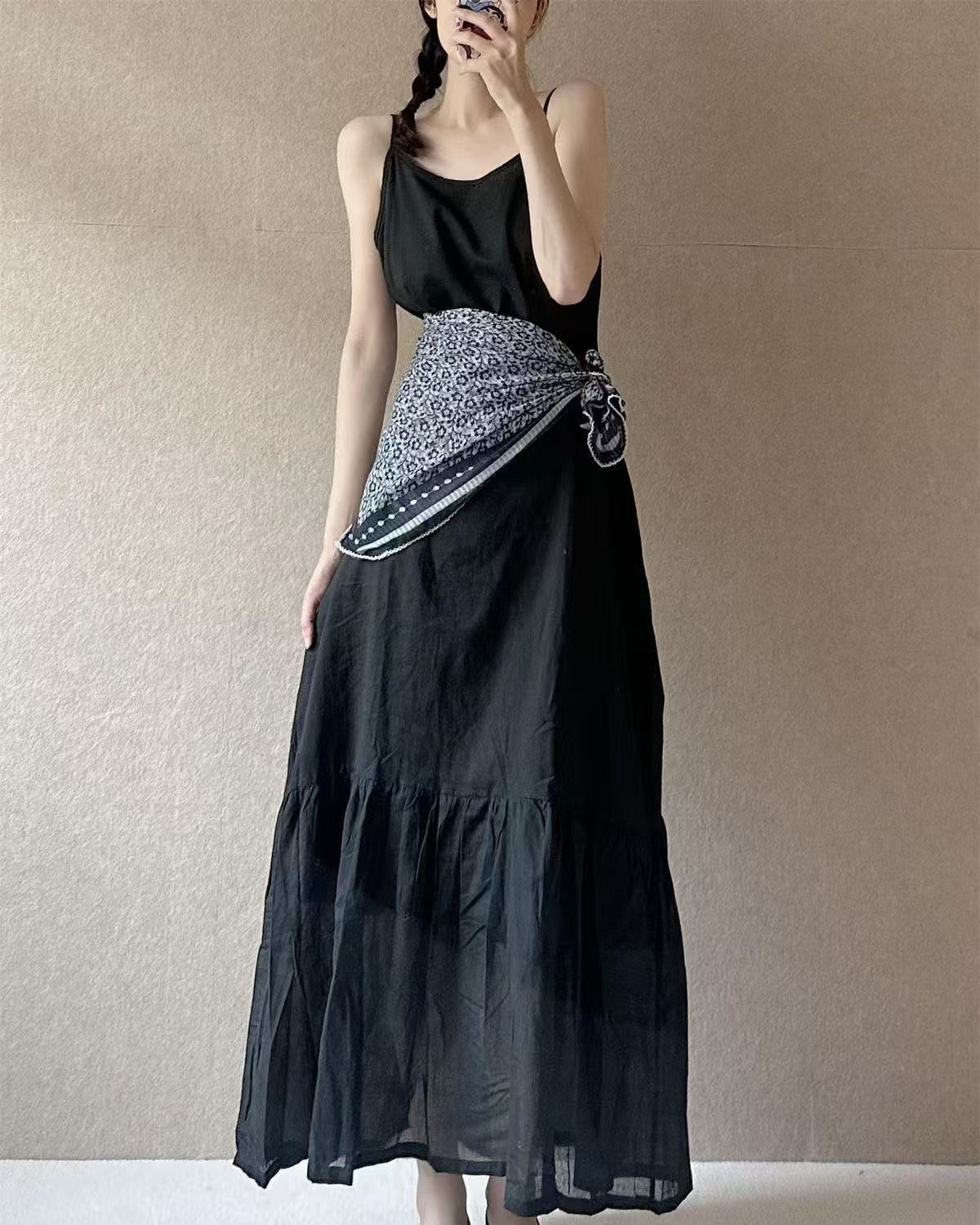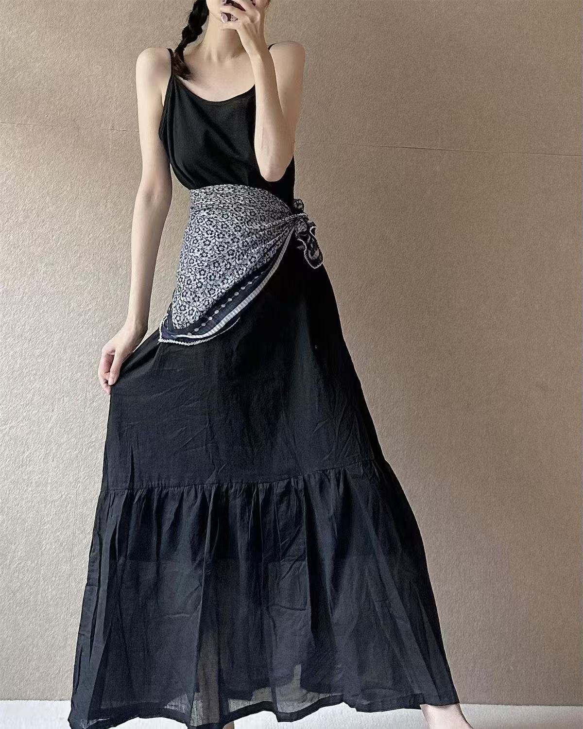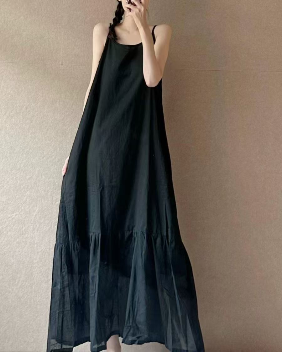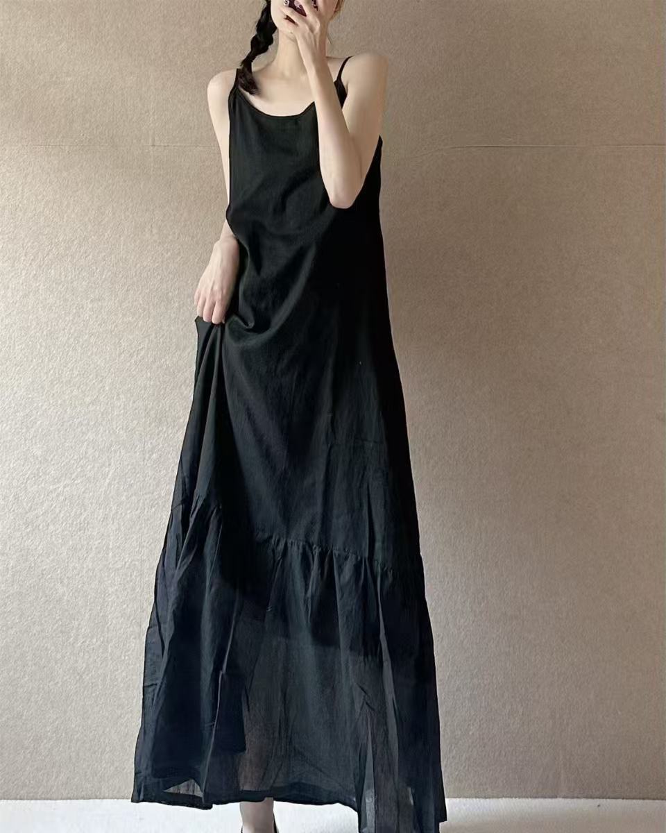 棉麻純色連衣裙簡約拼接吊帶裙2025夏季氣質女裝新款寬松文藝長裙