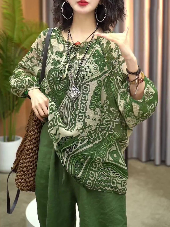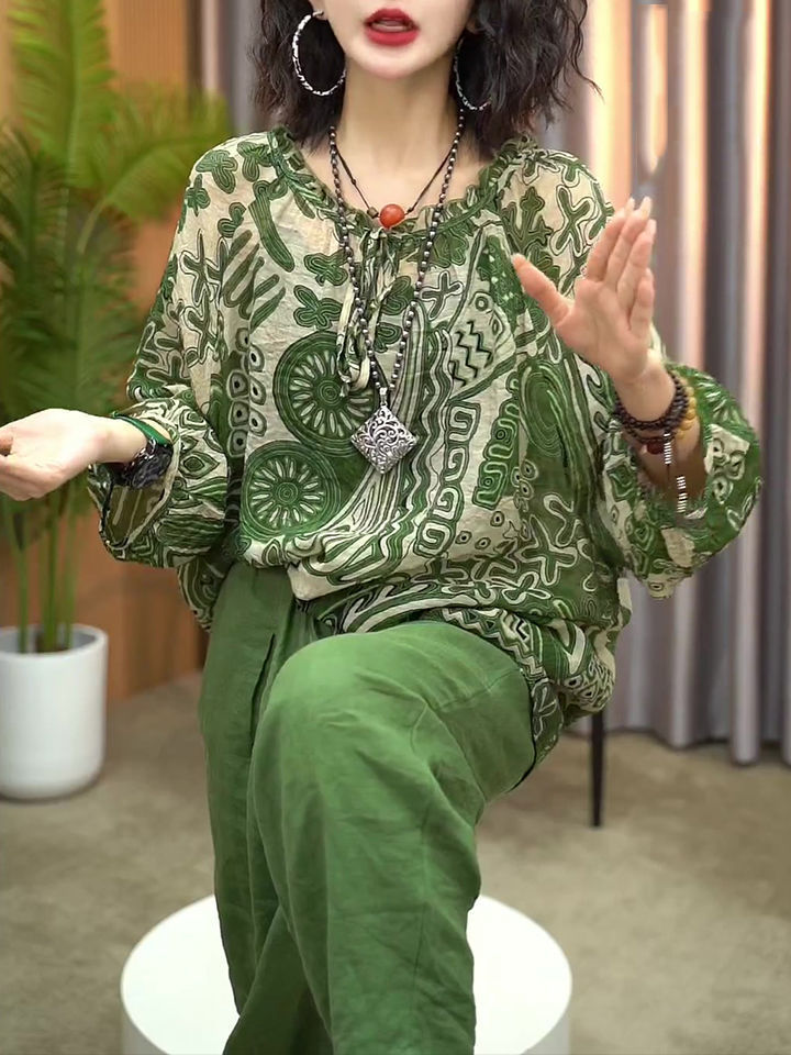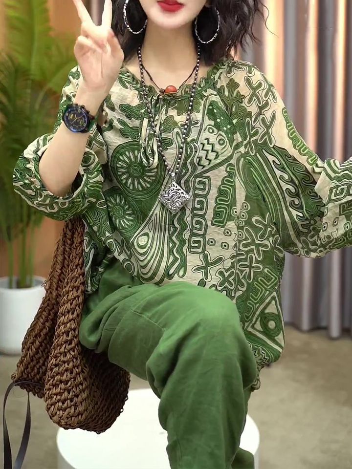 復古風印花大碼2025春夏新款女裝T恤寬松中老年媽媽套頭防曬上衣