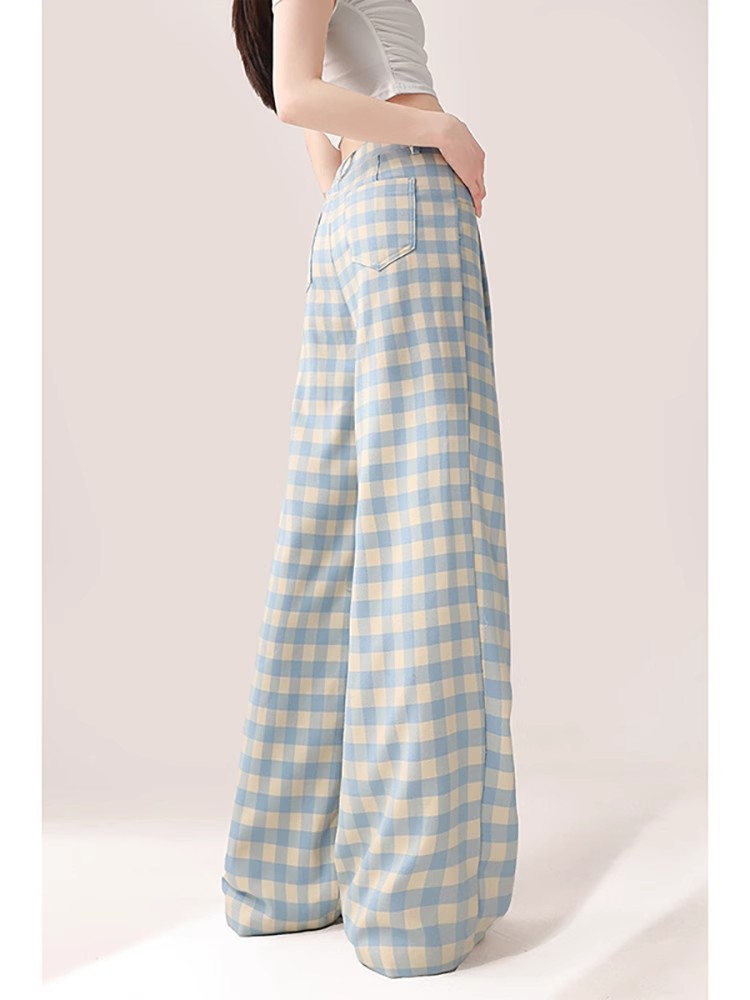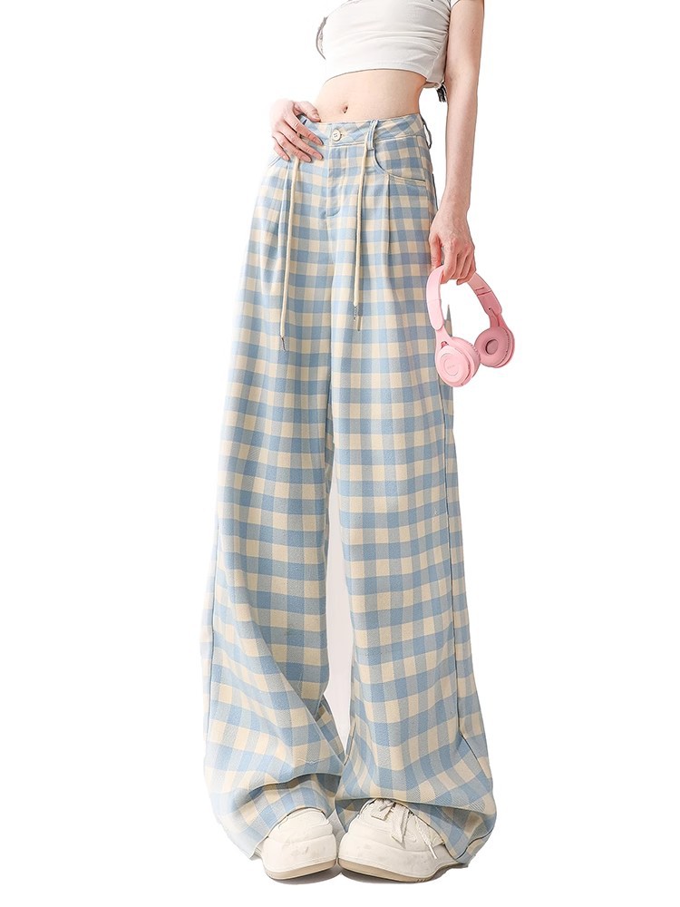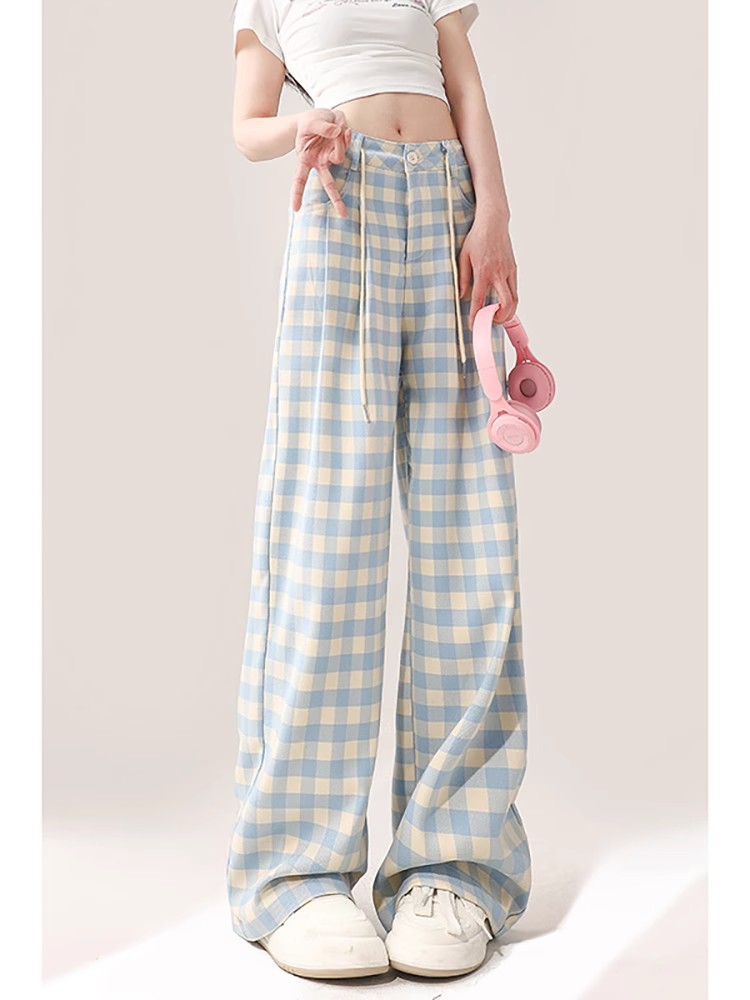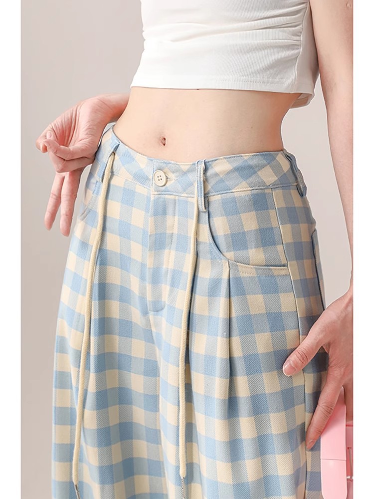 【內包邊】藍色格子闊腿褲女夏季跨境美式新款高腰寬松直筒休閑褲