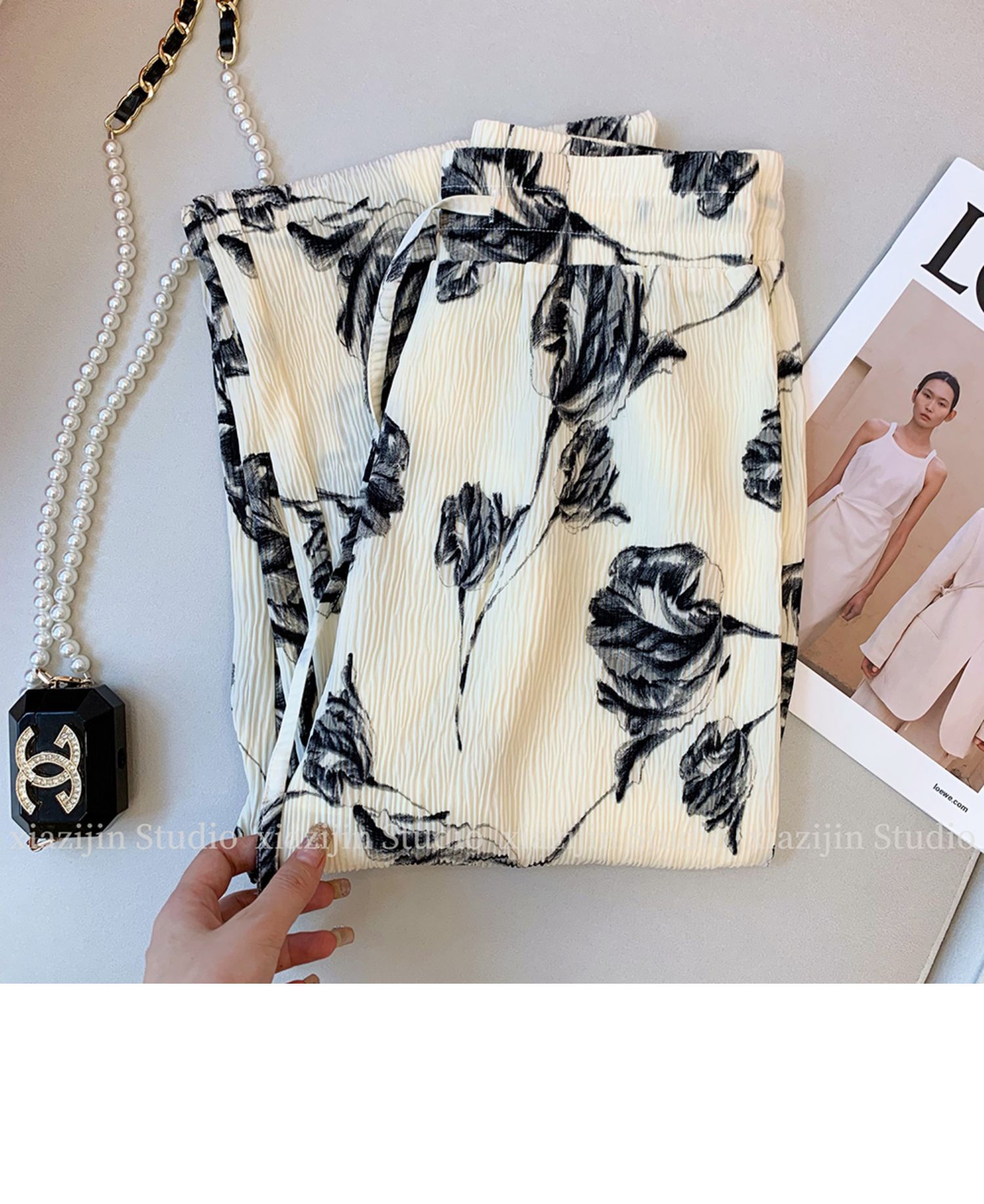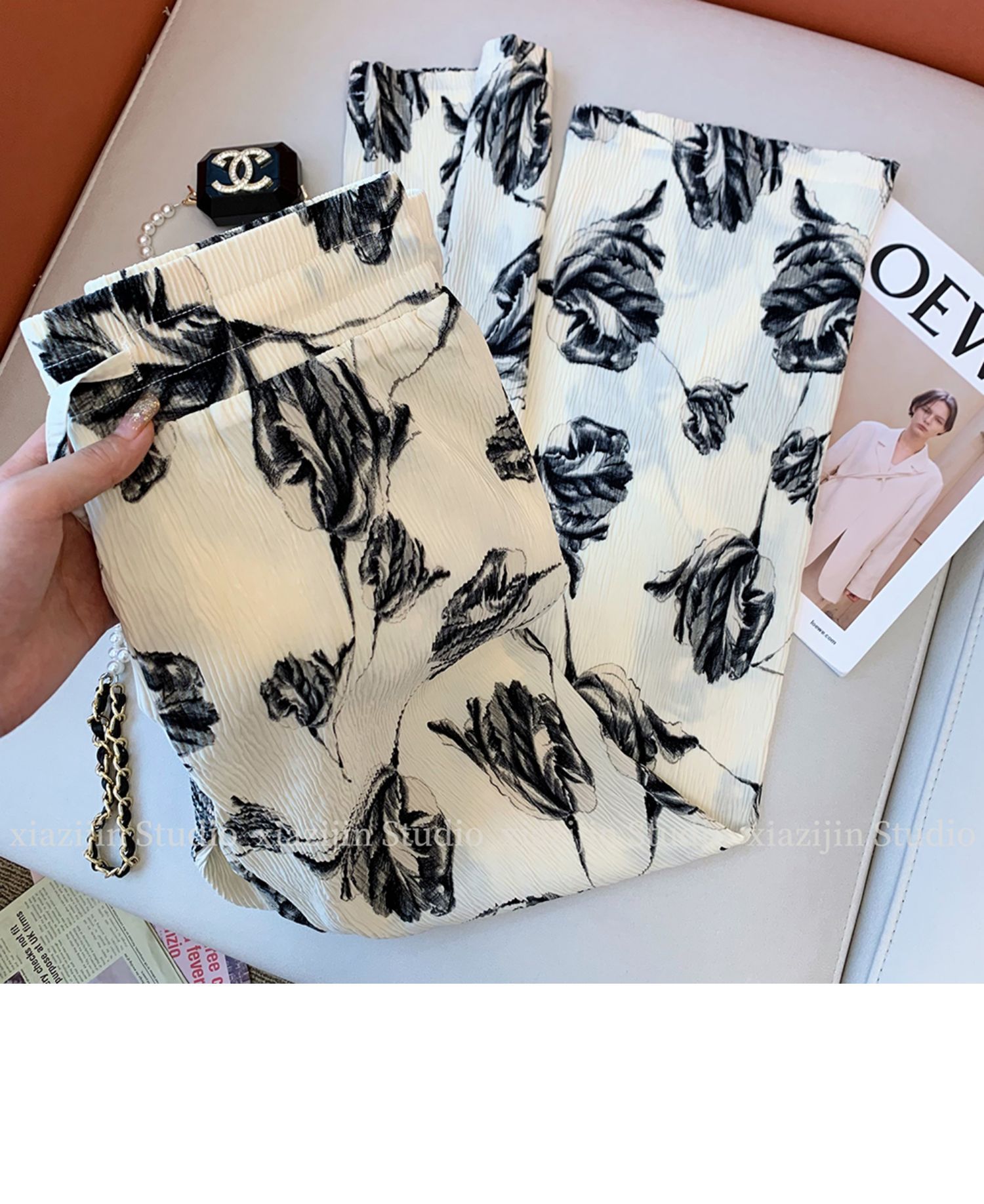 L~6XL大碼200斤顯瘦國風中式碎花闊腿褲女2025新款夏季小個子長褲
