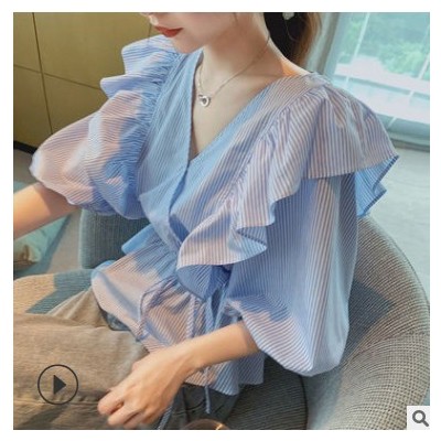 首頁 > 供應(yīng)產(chǎn)品 > 藍(lán)色條紋荷葉邊上衣2021新款韓版夏季短袖V領(lǐng)襯衫女氣質(zhì)女學(xué)生