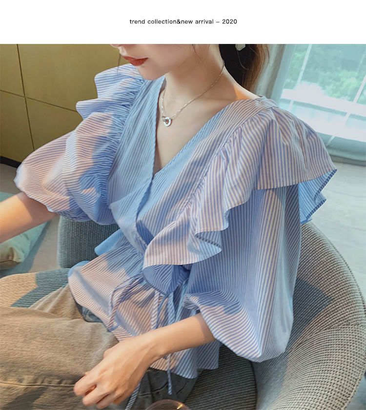 藍(lán)色條紋荷葉邊上衣2021新款韓版夏季短袖V領(lǐng)襯衫女氣質(zhì)女學(xué)生