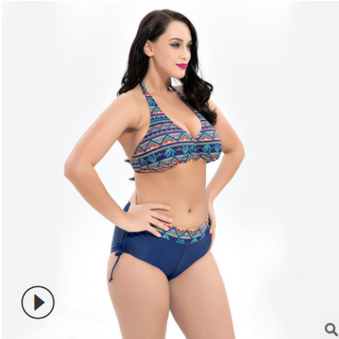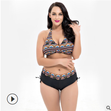 歐美新款大碼加肥加大分體掛脖系帶印花高腰泳裝女亞馬遜跨境專供