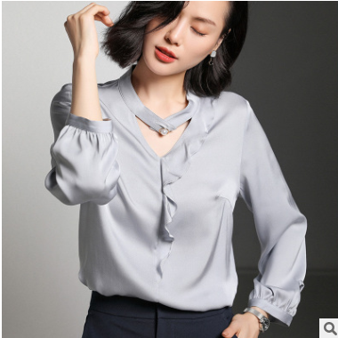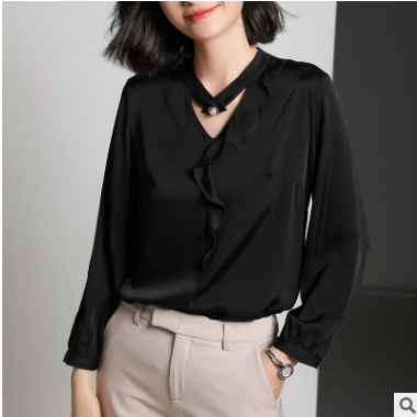 新款女裝純色真絲上衣珍珠扣2019夏季簡約氣質桑蠶襯衫女修身襯衣