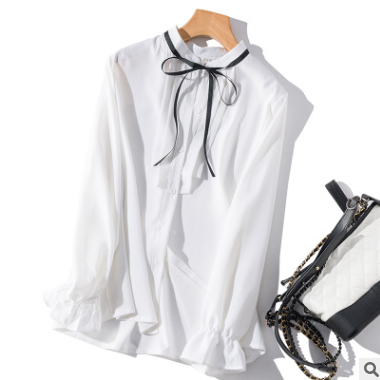 2019新款歐美高端精品女裝批發(fā)春夏真絲襯衫蝴蝶結(jié)系帶襯衣女