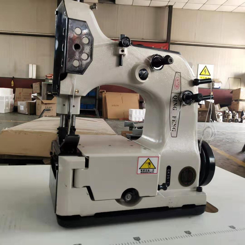 工作過程:將縫紉機(jī)裝配在臺板上;開啟電源后踩下腳踏板啟動縫紉機(jī),縫好每一袋時手推袋角切刀剪切線辮,松開腳踏板縫紉機(jī)停機(jī)。