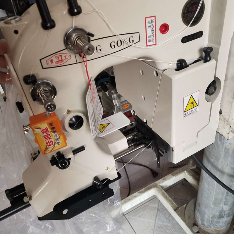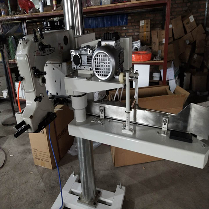 工作過程:裝配在輸送機上,當裝滿物料的編織袋到達離縫包機10厘米處,在光控開關控制下縫包機自動啟動,縫合袋口,縫好每一袋時,切刀自動剪斷線辮,縫包機自動停機。