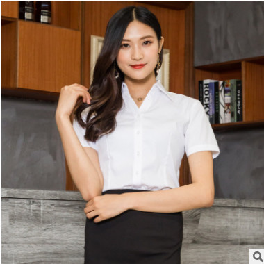 女襯衫價格斜紋短袖職業裝襯衣棉質V領商務修身女夏女裝職業襯衫