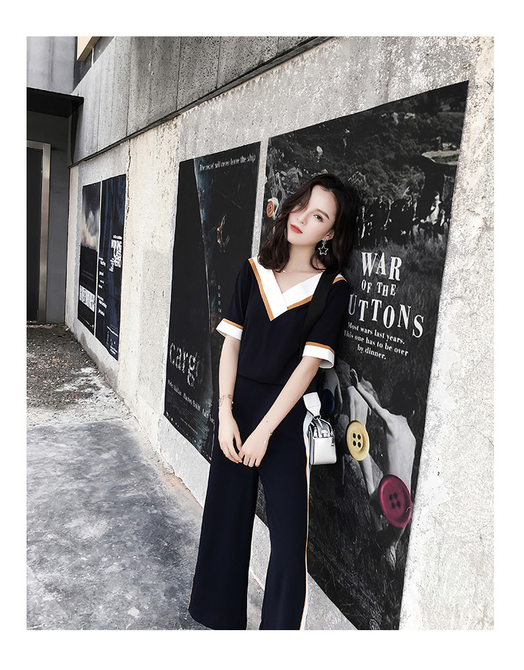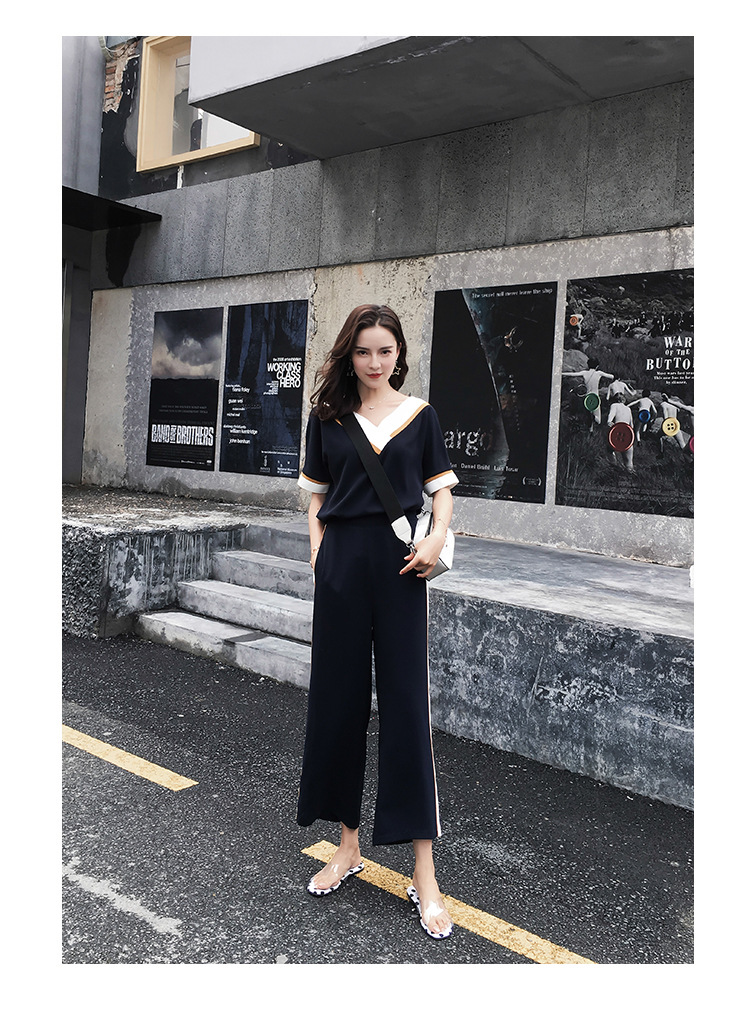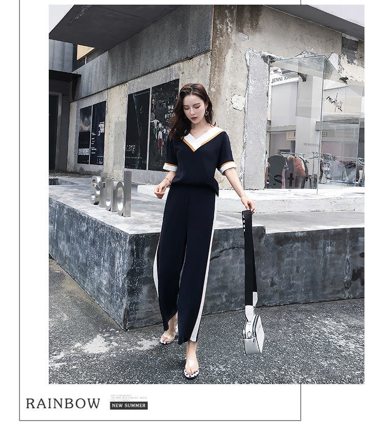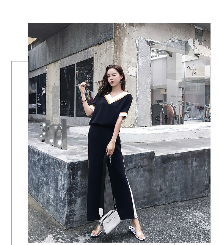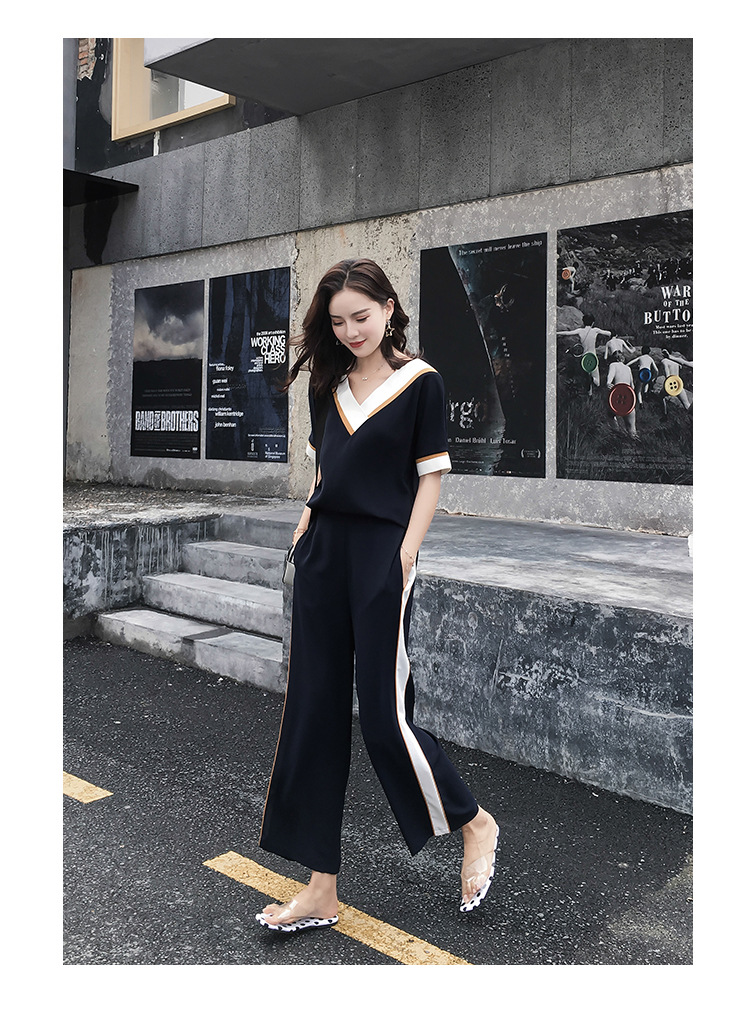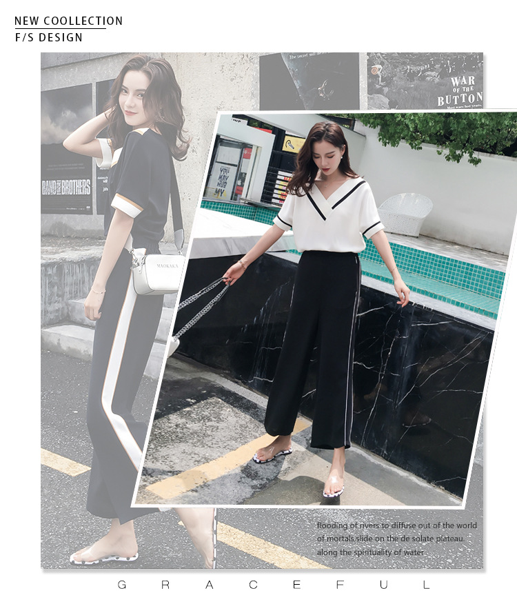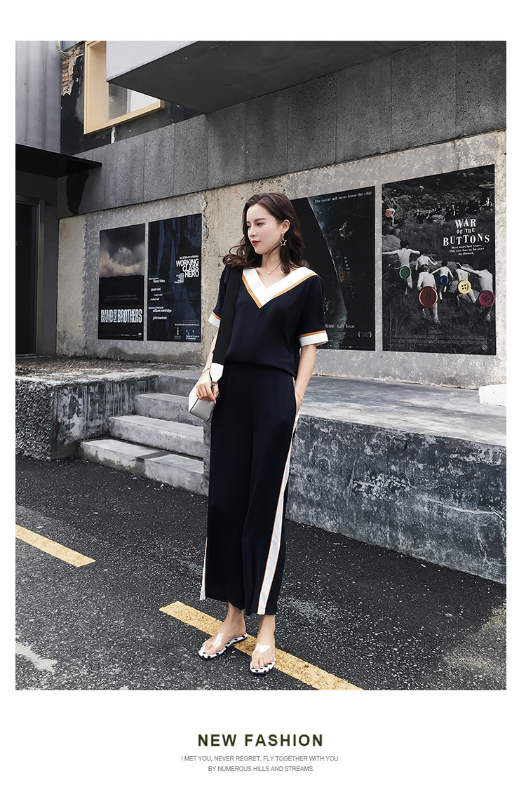 實拍2019夏季女裝新款時尚百搭氣質套裝V領上衣闊腿褲兩件套