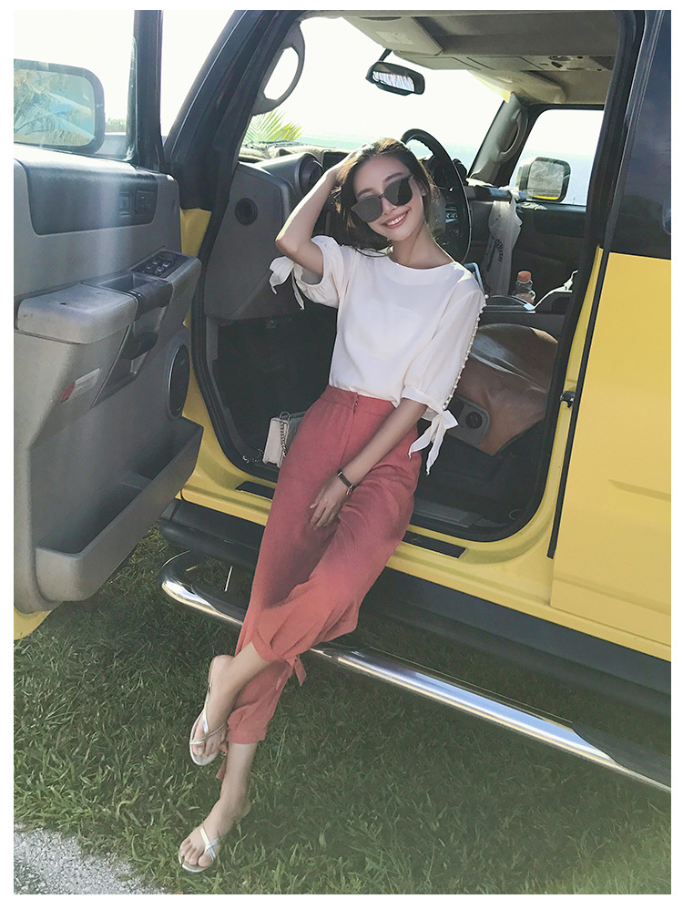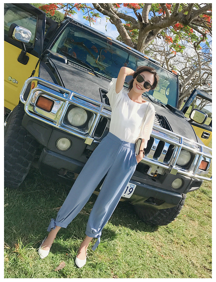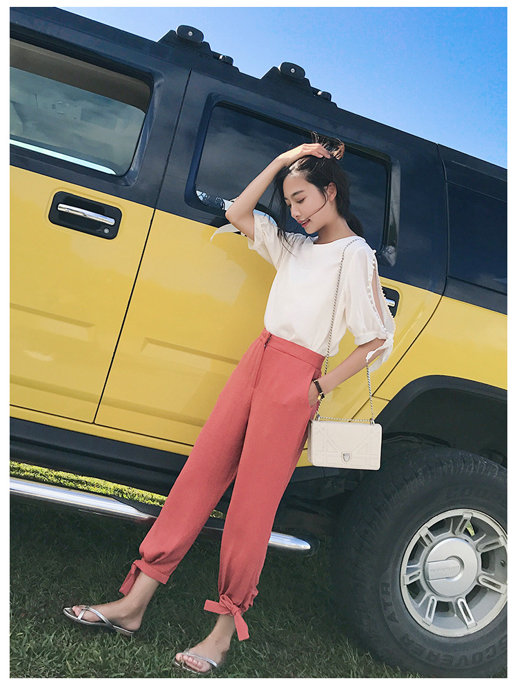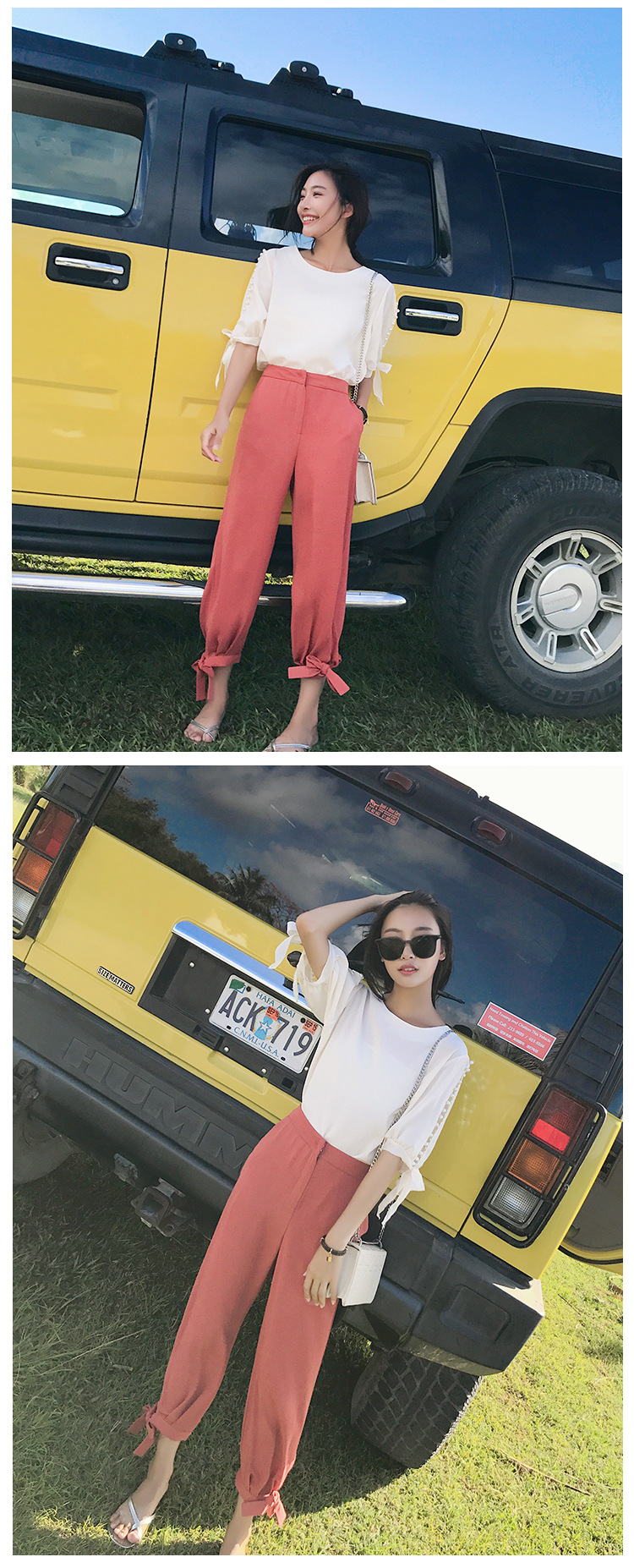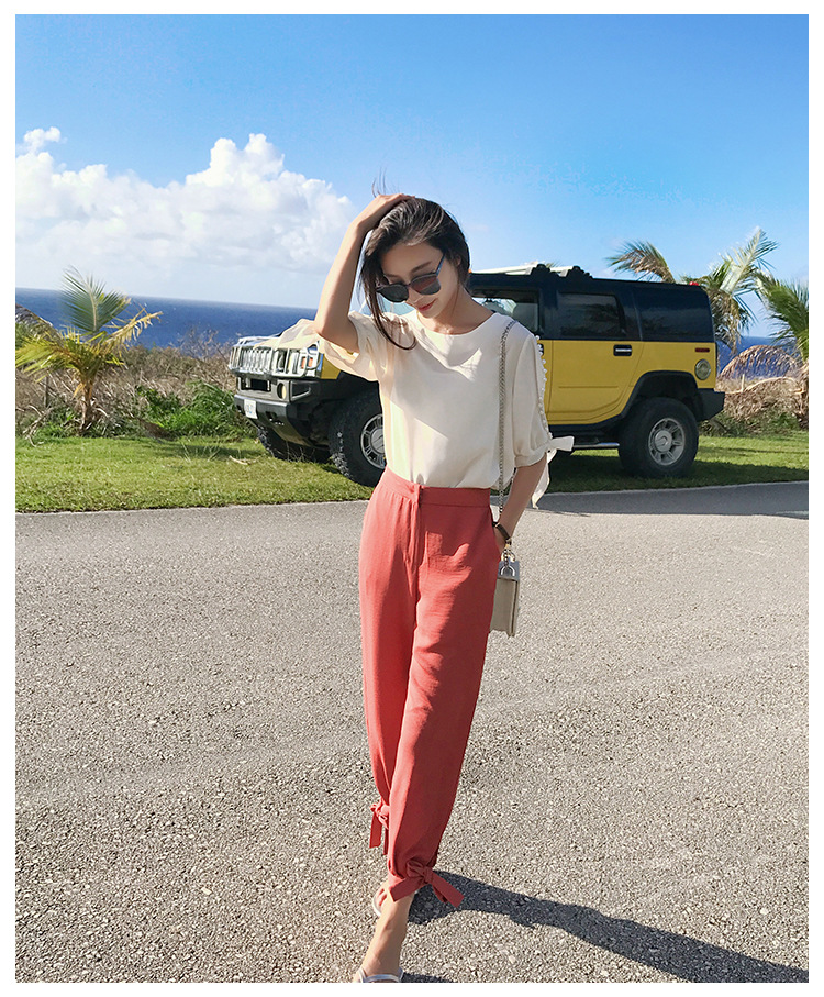 實拍2019夏季女裝新款休閑時尚九分褲搭配袖子釘珠T恤套裝
