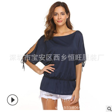 跨境歐美爆款eBay亞馬遜2019夏季新款女裝 圓領露肩寬松短袖T恤女