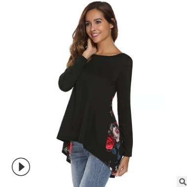 2019跨境新款速賣通亞馬遜秋季熱賣款 印花遮臀寬松長袖T恤女現貨