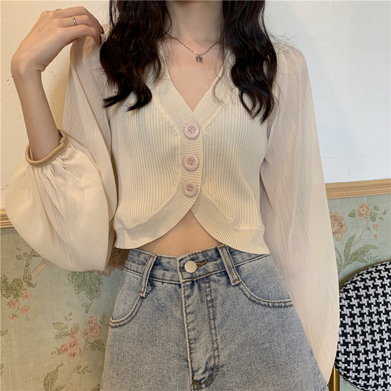 溫柔風V領開衫防曬衫毛衣外套修身短款夏季2021新款長袖針織衫