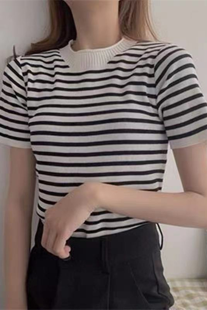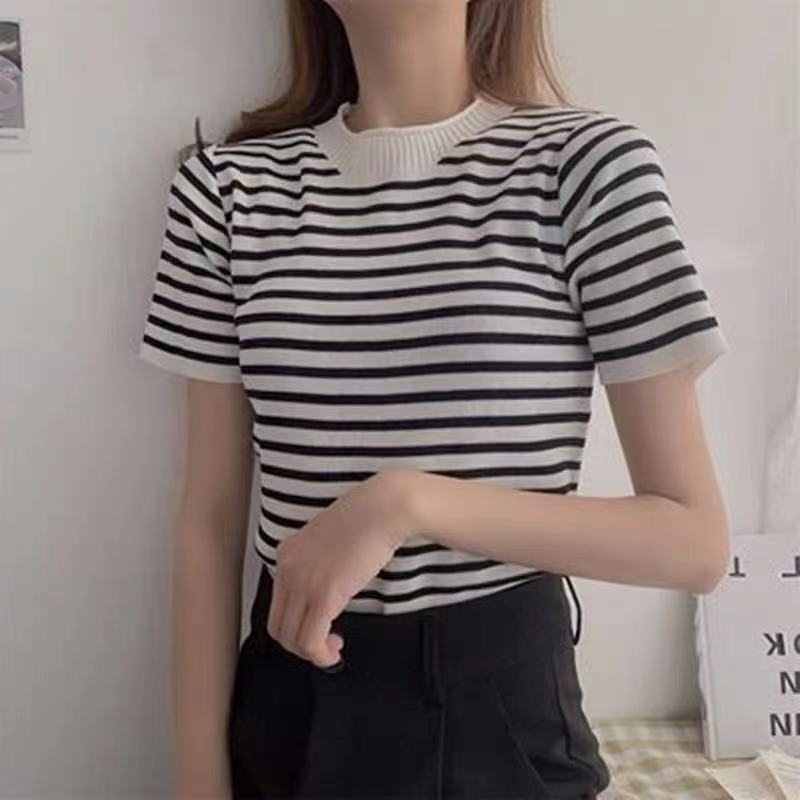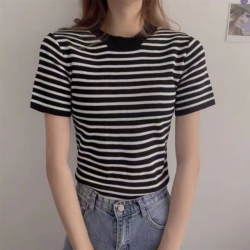 韓風chic上衣夏女裝2021新款ins潮韓版顯瘦條紋針織打底衫短袖T恤