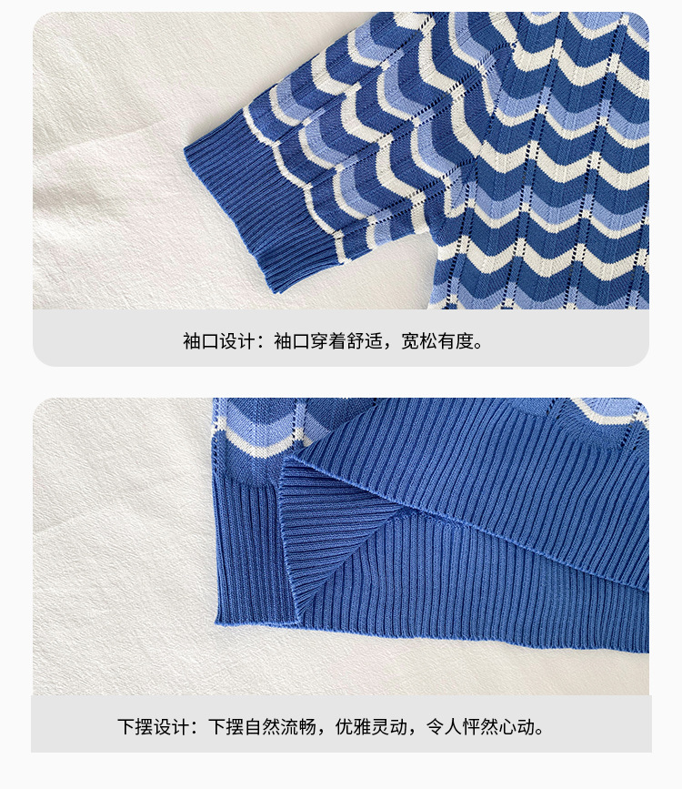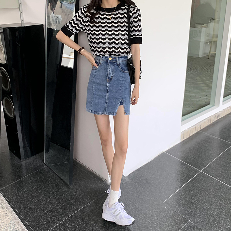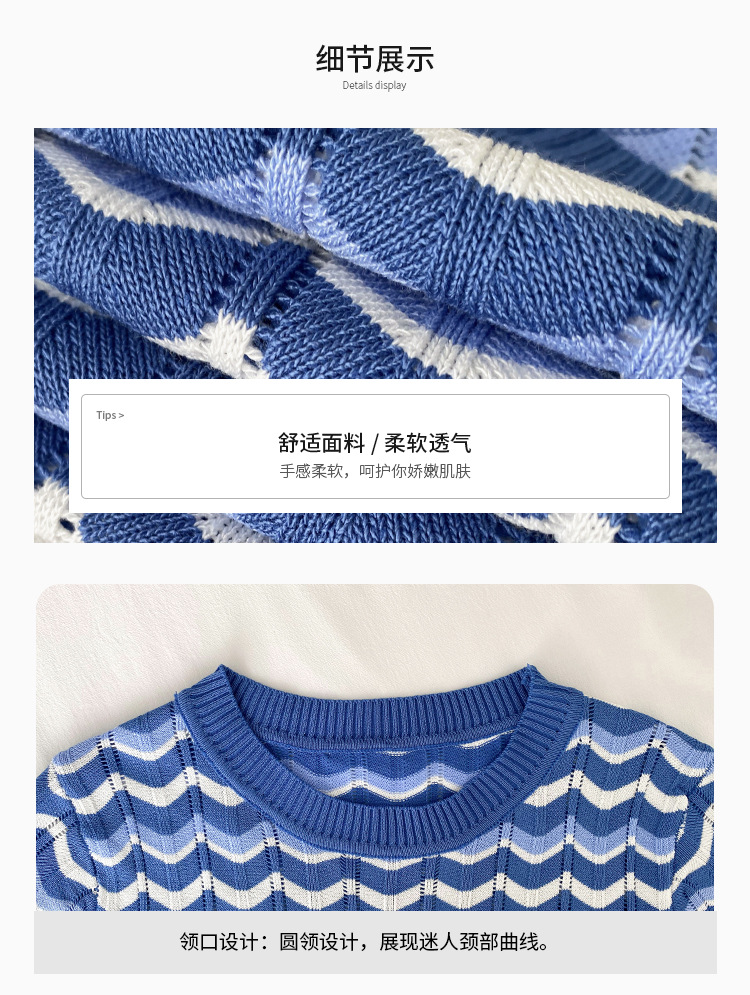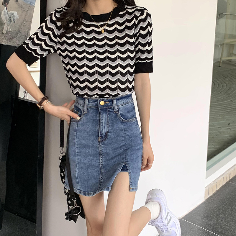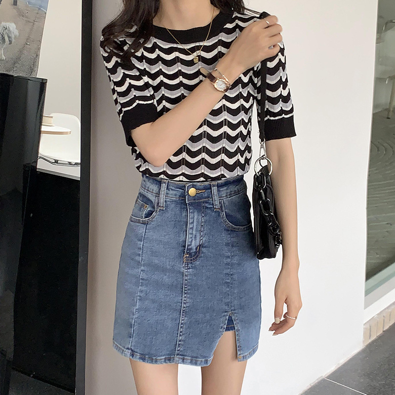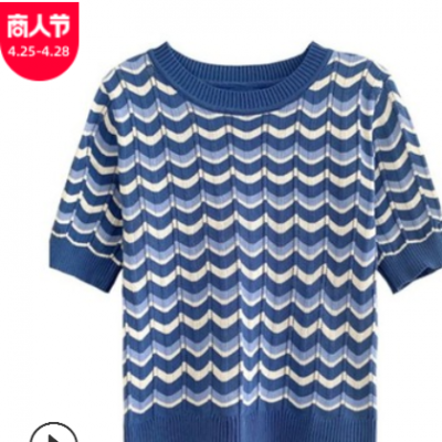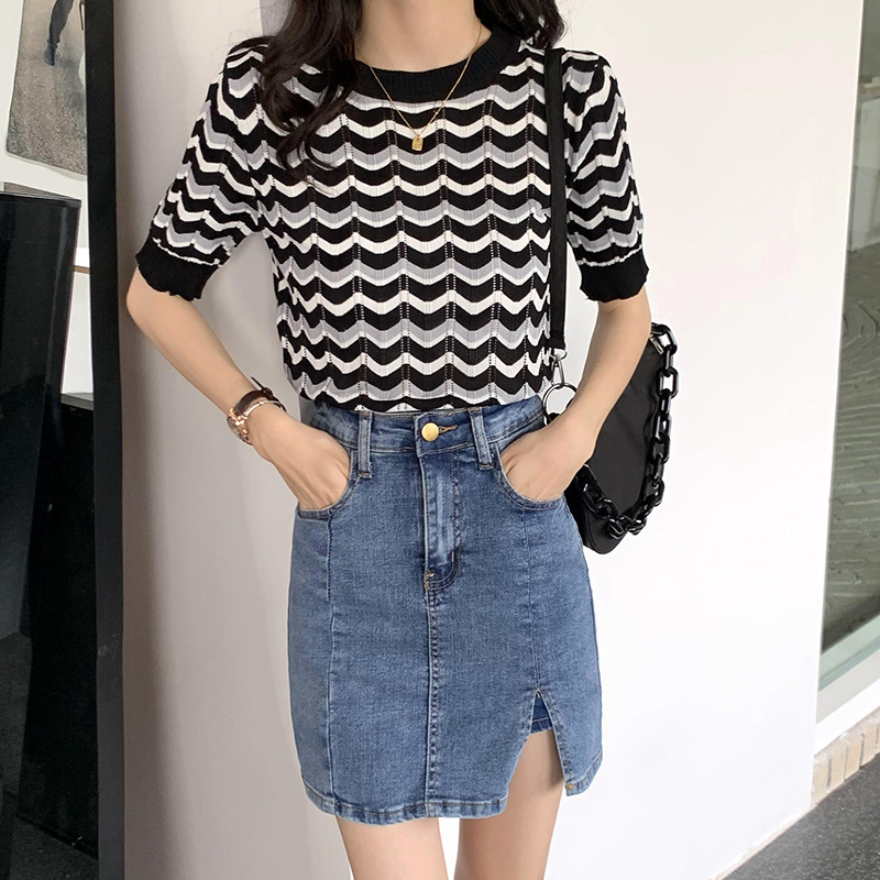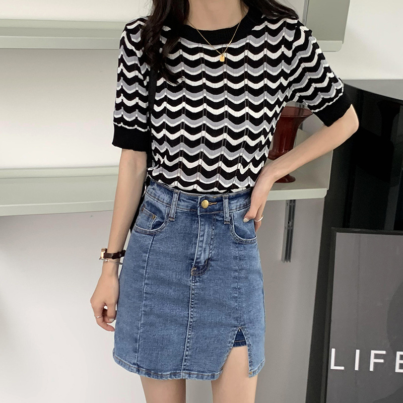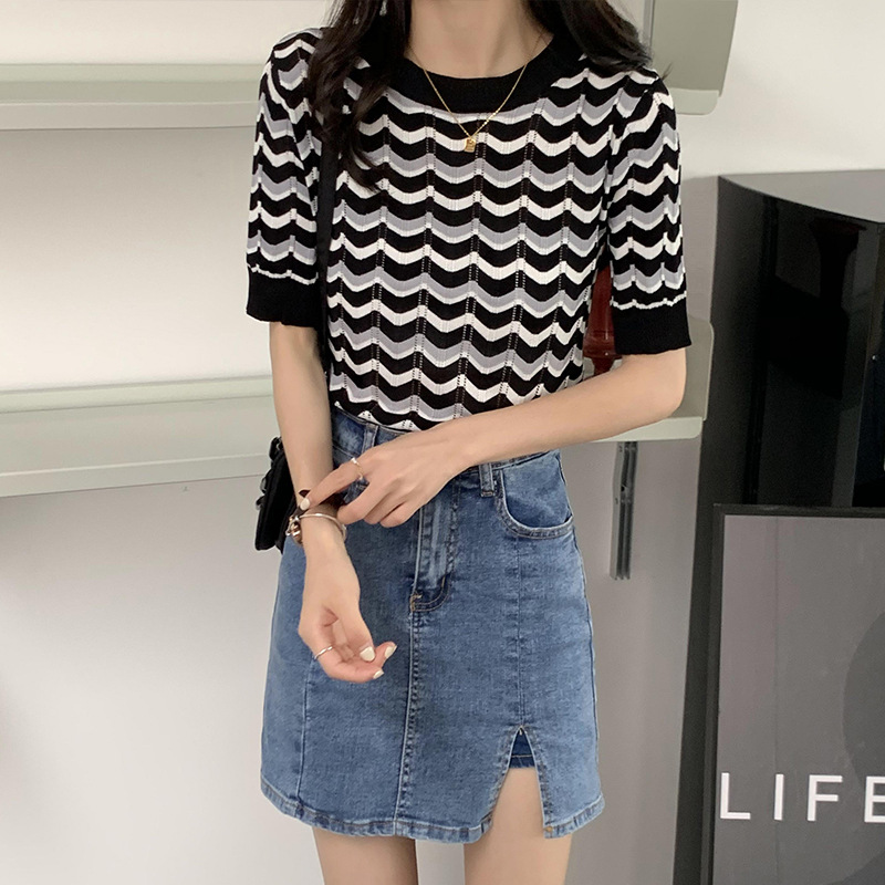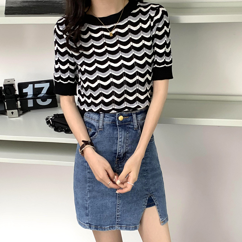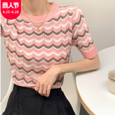 春夏款2021韓風(fēng)chic上衣韓版修身顯瘦波浪條紋冰絲針織短袖T恤女