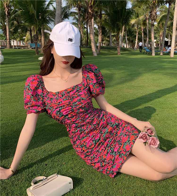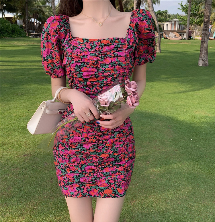 法式碎花包臀連衣裙夏裝新品泡泡短袖方領高腰修身洋氣性感短裙子