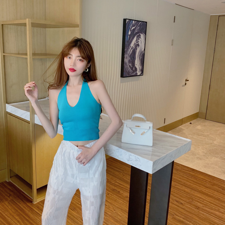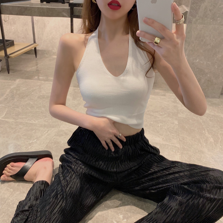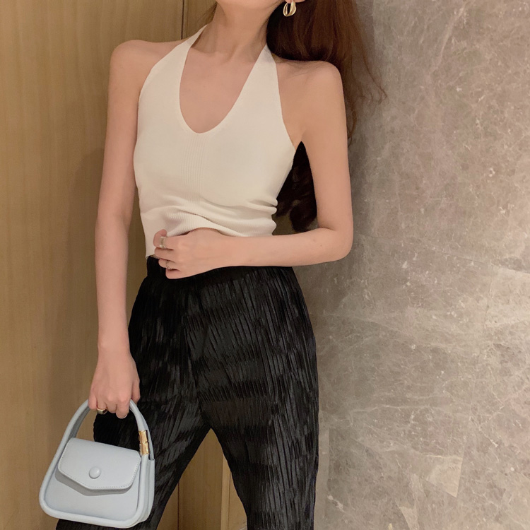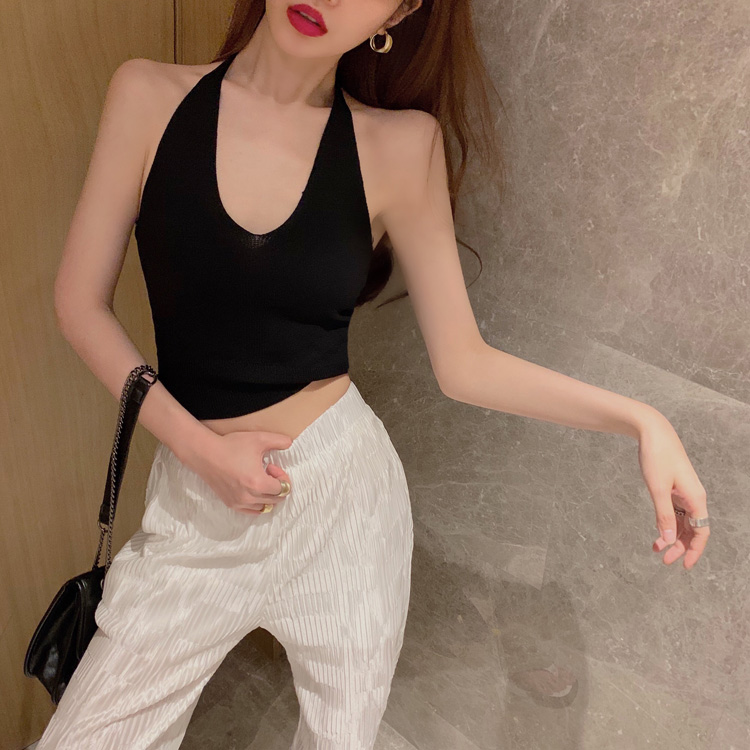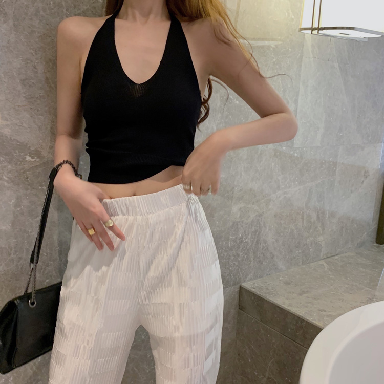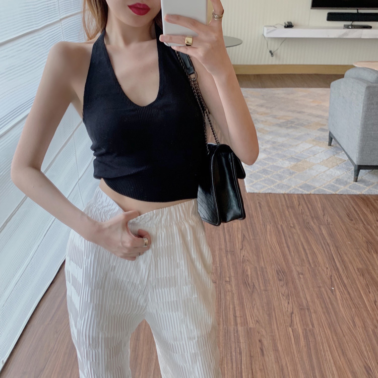 港味時尚休閑女裝2021夏季新款V領掛脖露背小背心垂墜感高腰長褲