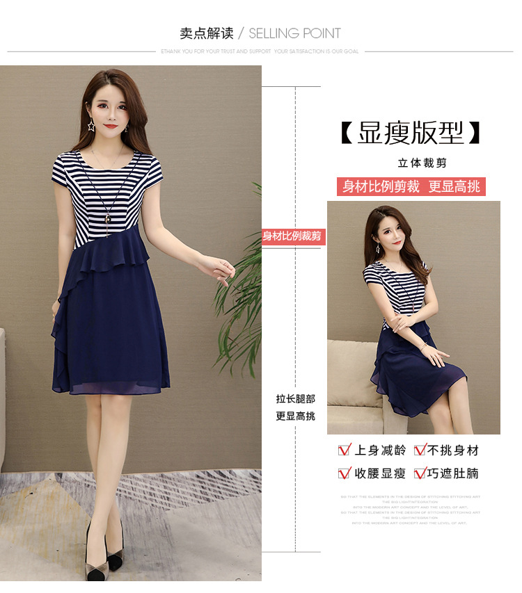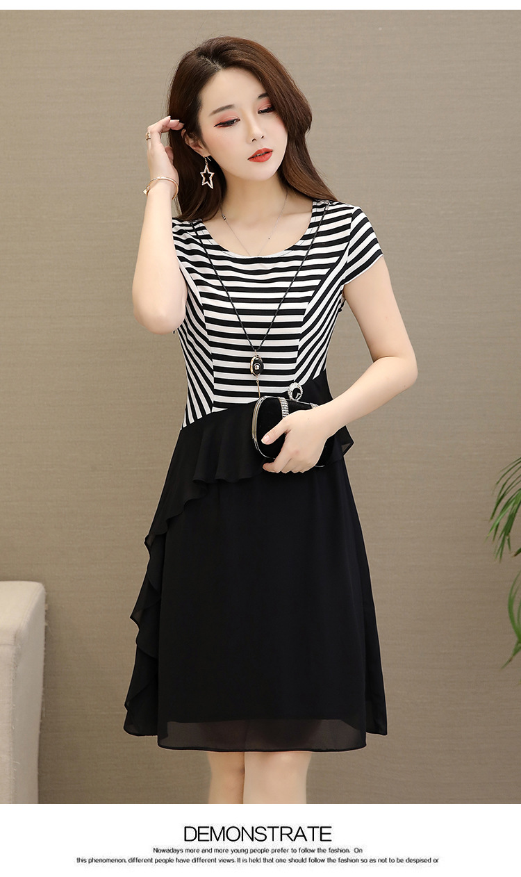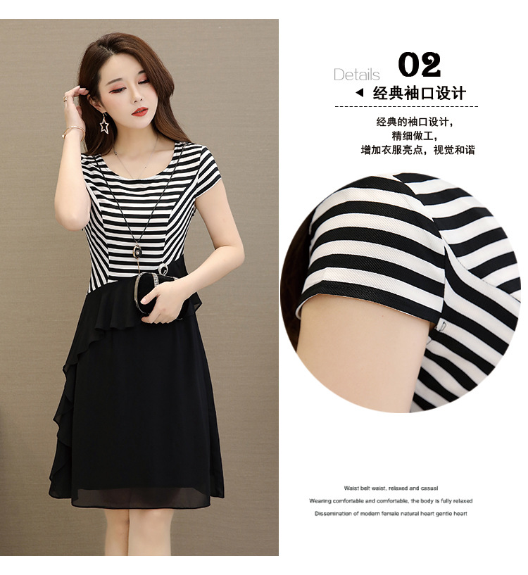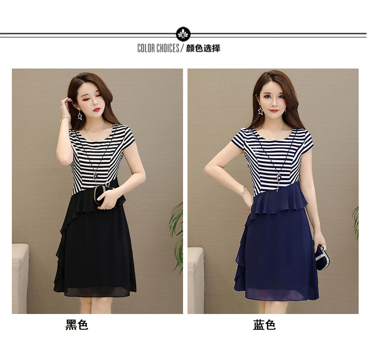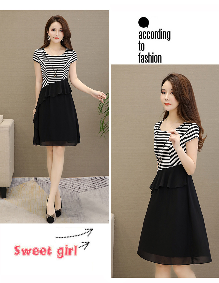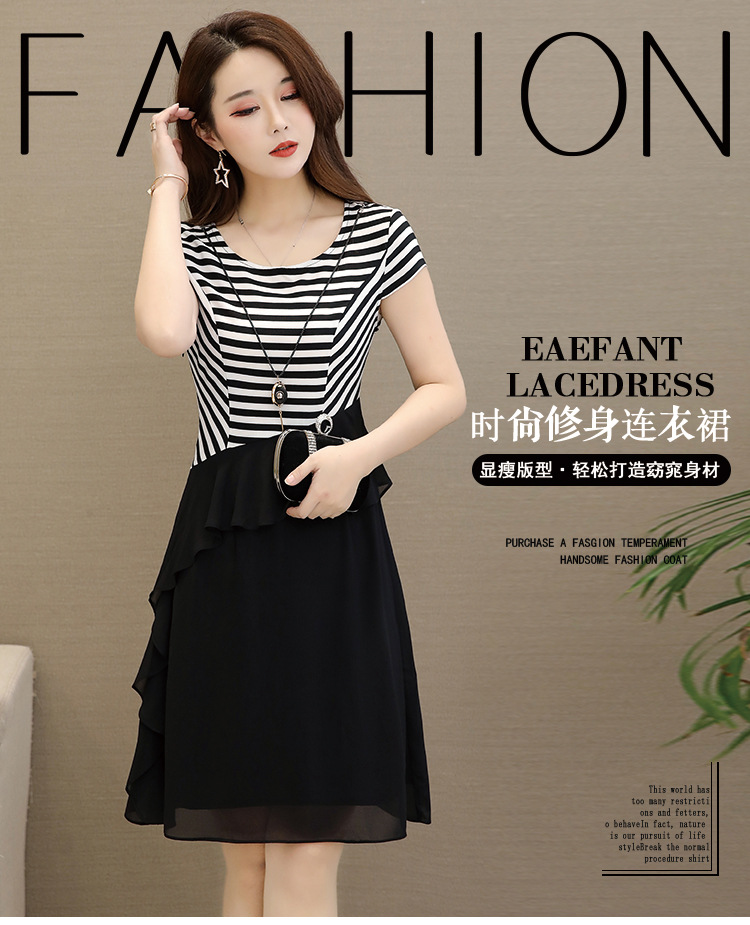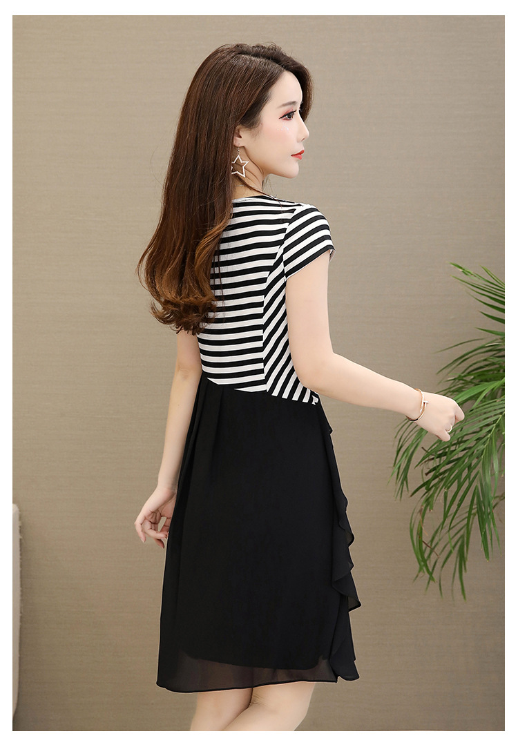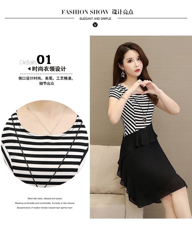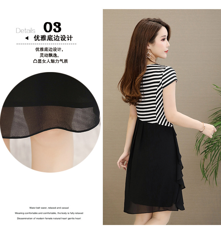 2019夏季新款黑色條紋連衣裙不規則雪紡短裙假兩件套裝薄