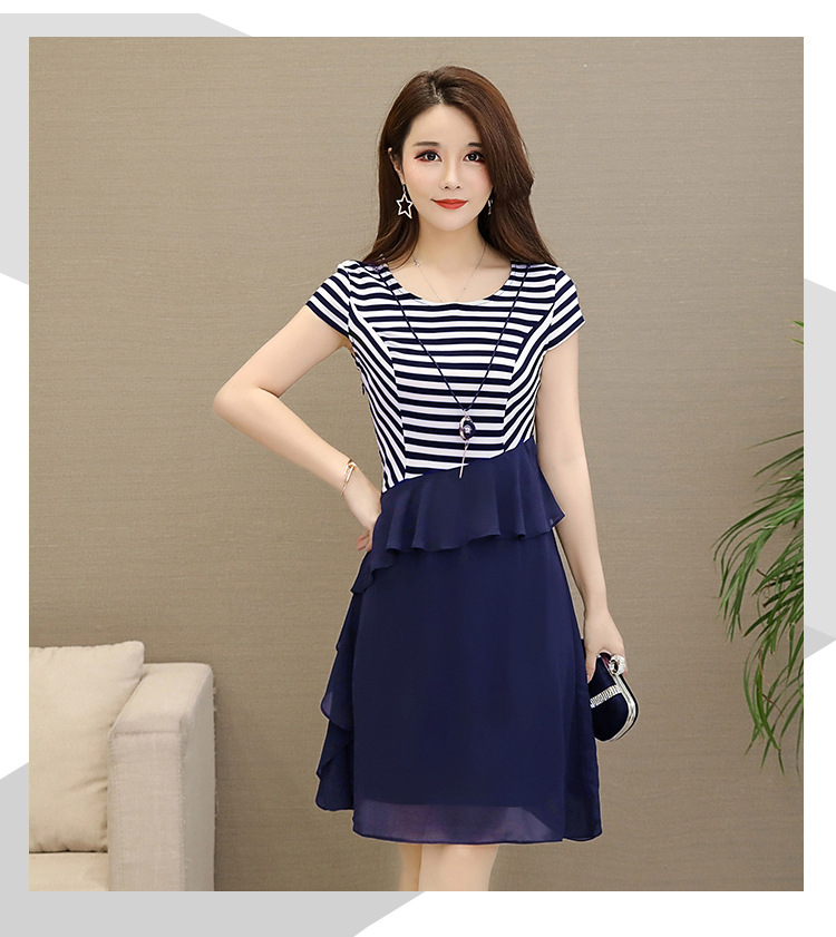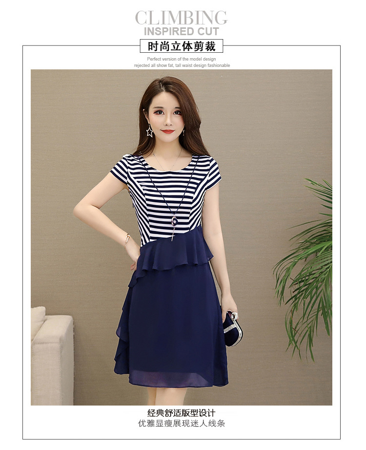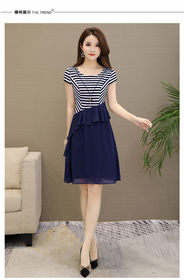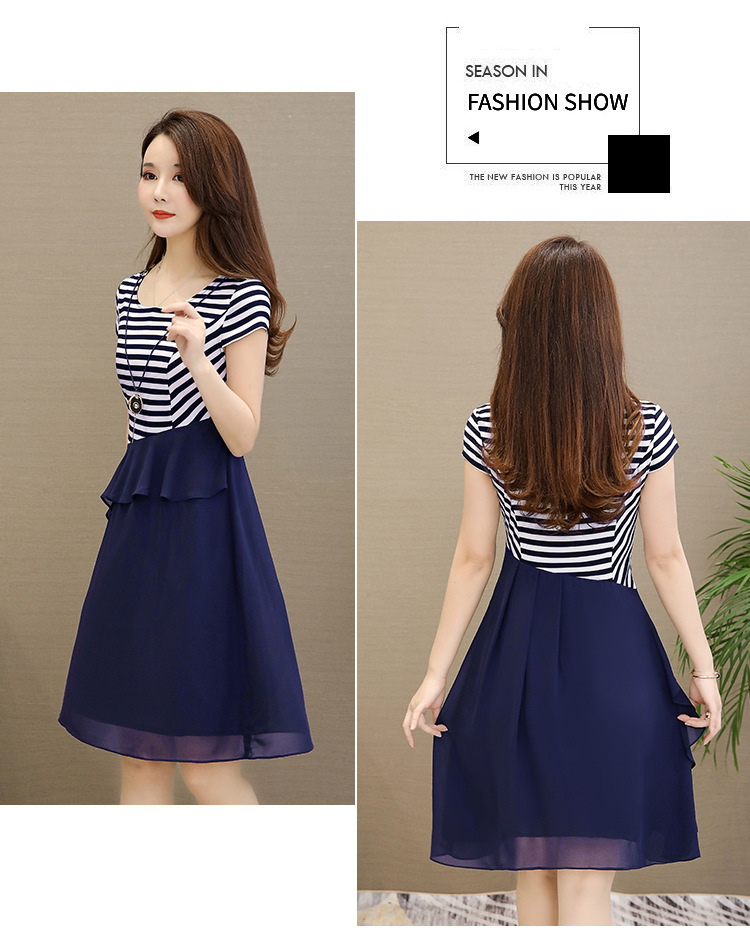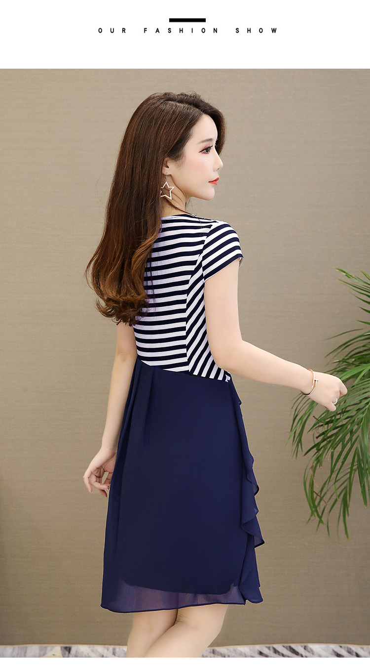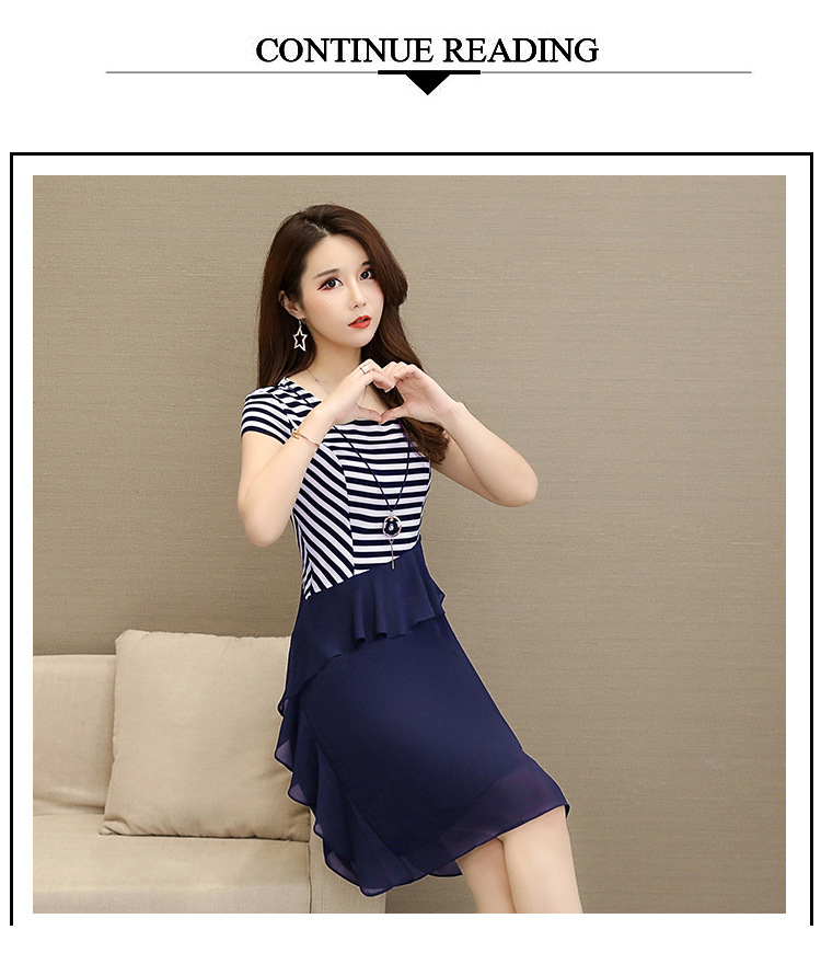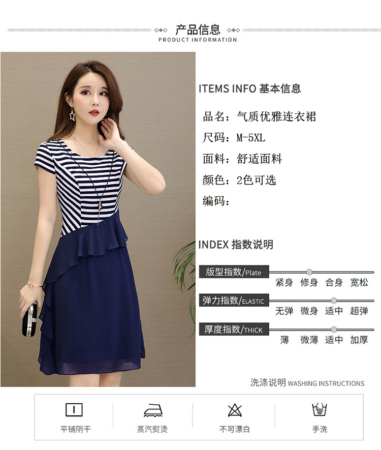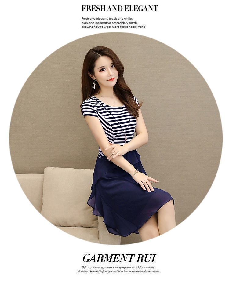 2019夏季新款黑色條紋連衣裙不規則雪紡短裙假兩件套裝薄