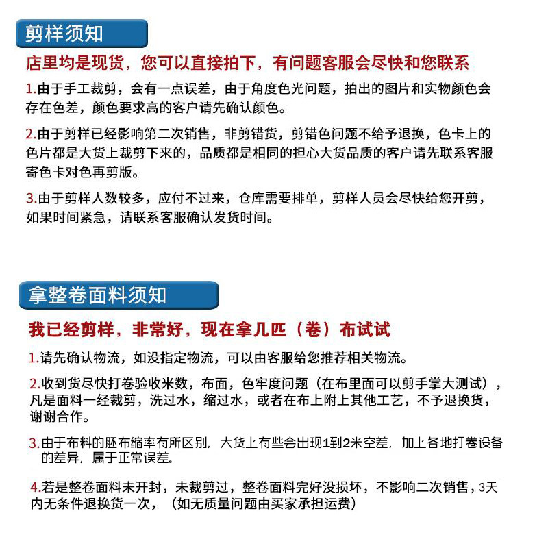 收貨后3天內如發現品質問題可退換貨,已經開剪或經后加工后處理的則不作退換貨處理,請您諒解!