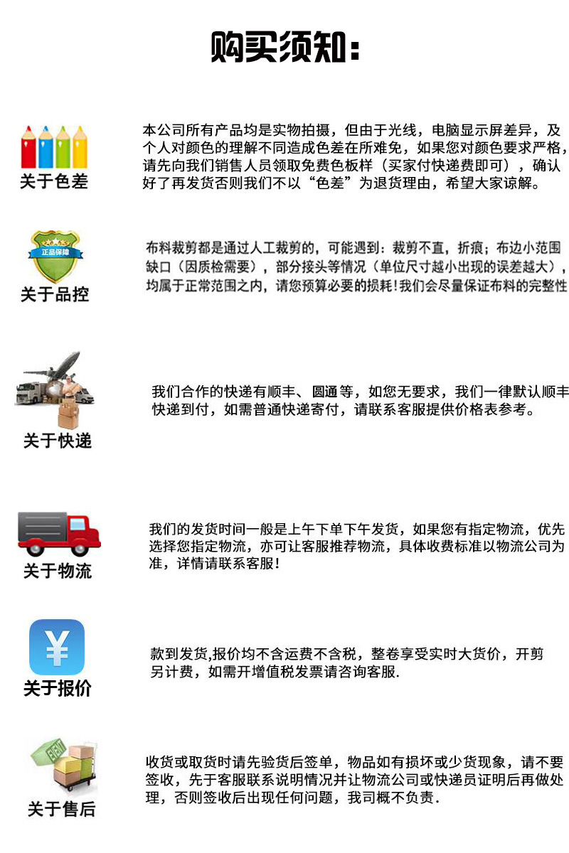 收貨后3天內如發現品質問題可退換貨,已經開剪或經后加工后處理的則不作退換貨處理,請您諒解!