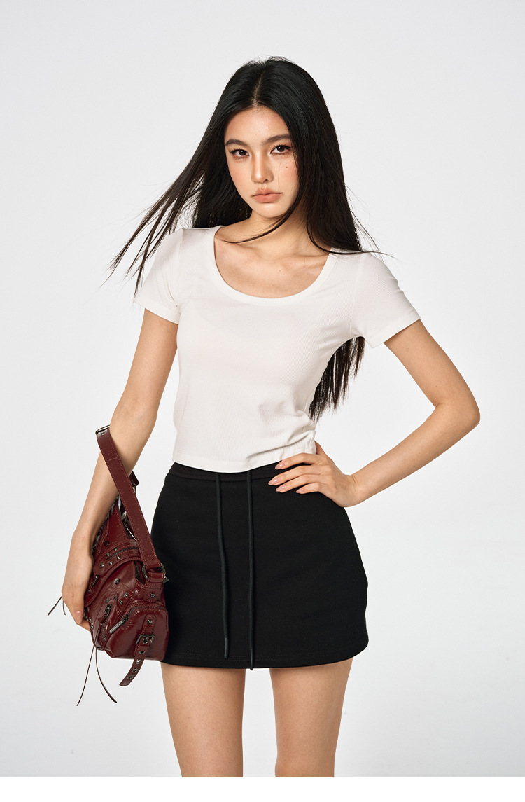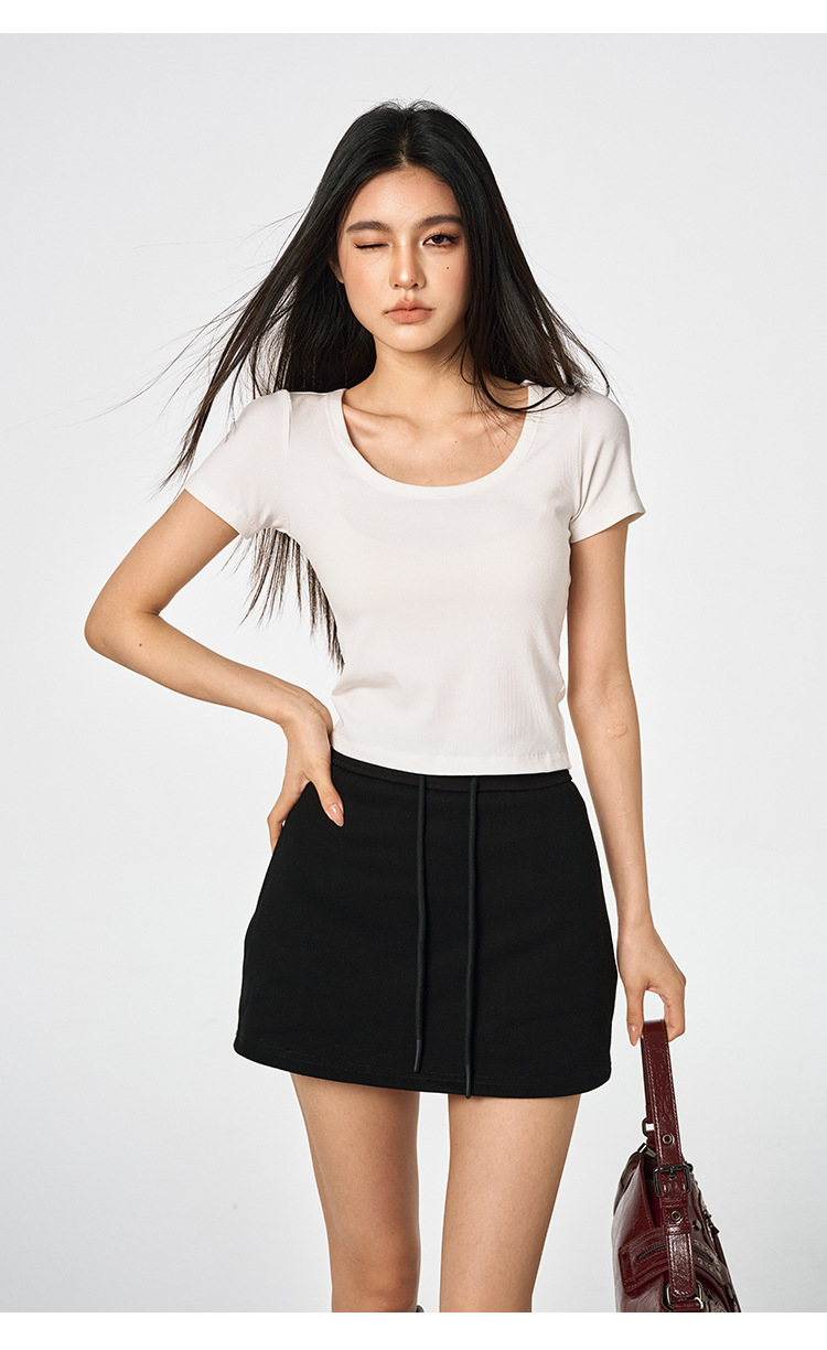 短款氣質短袖體恤女款辣妹百搭小眾U領螺紋打底修身羅紋短上衣T恤