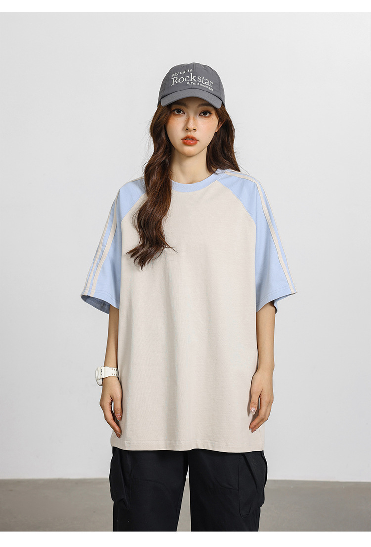 270g夏季新款插肩短袖T恤男女潮牌條紋拼接情侶oversize五分袖衫