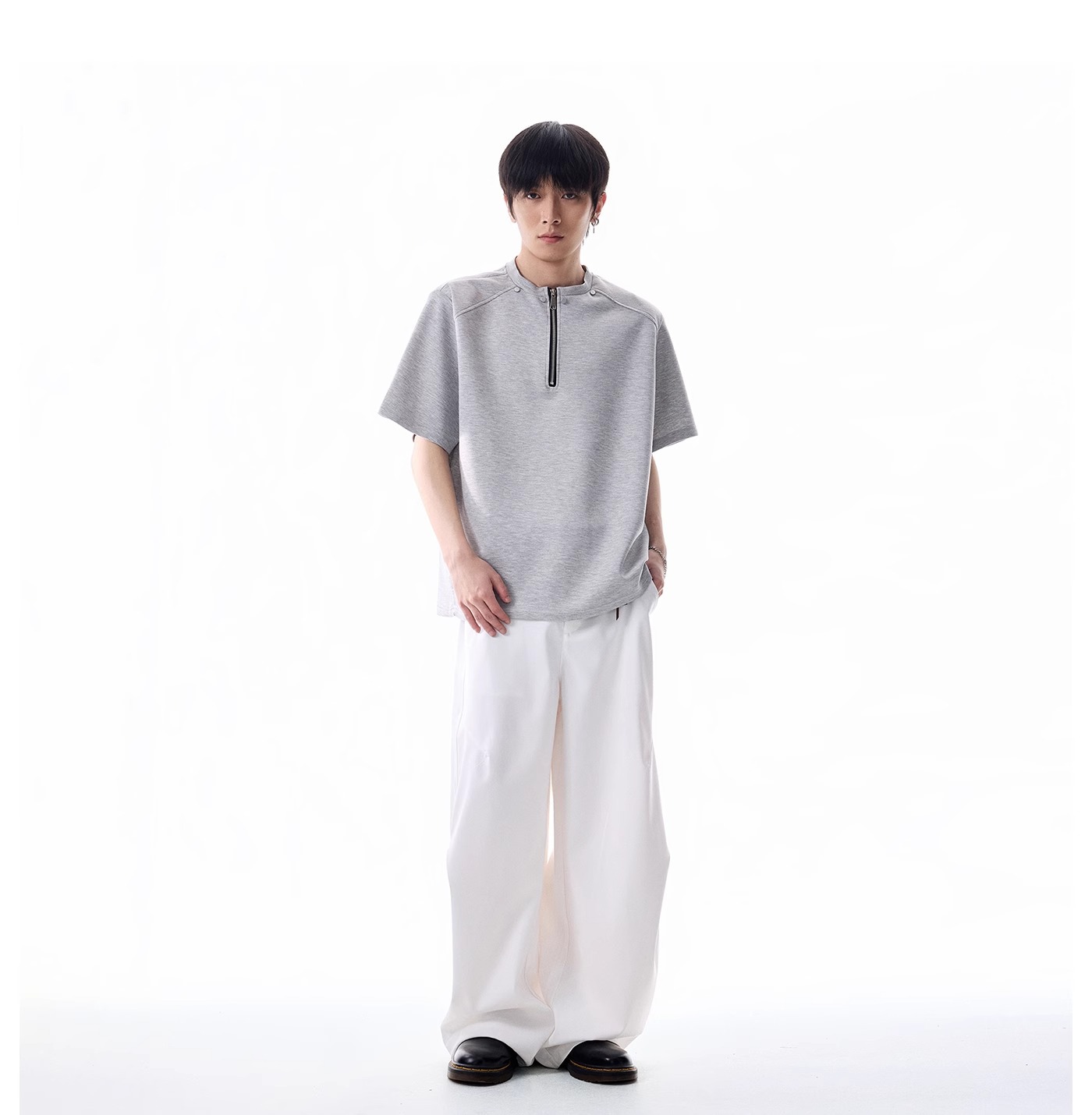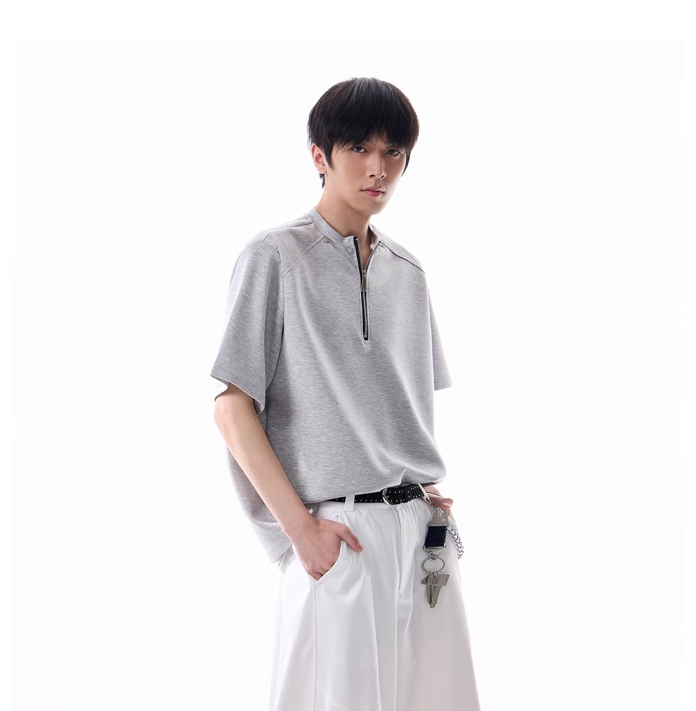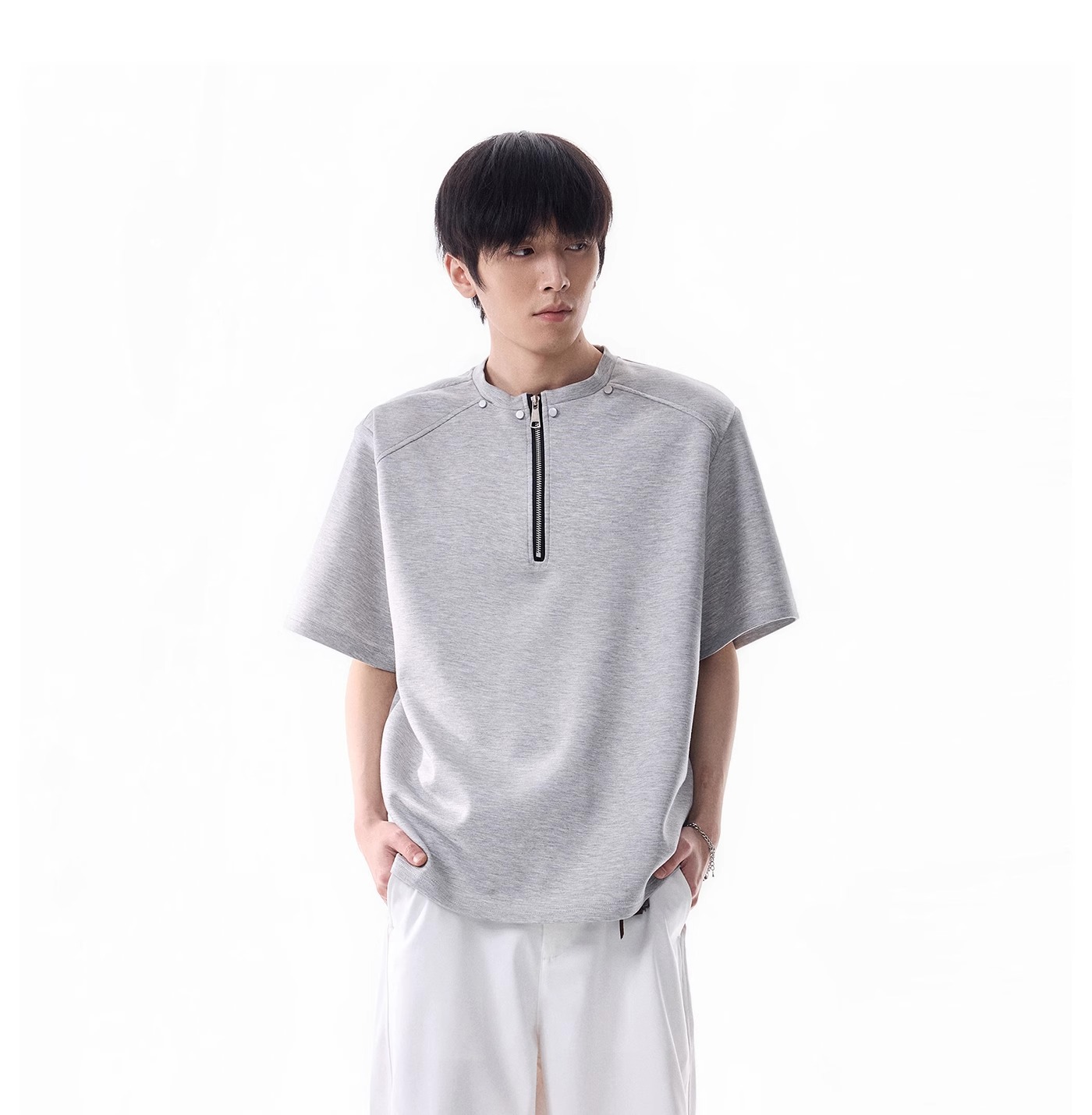 空氣層半拉鏈墊肩短袖t恤男2025夏新款美式潮牌亨利領鉚釘半袖t恤