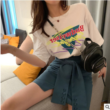 網紅同款系列 2019夏季新款寬松印花T恤綁帶高腰半身裙套裝女爆款