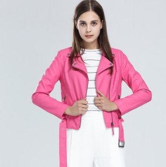2018皮衣女新款玫紅色腰帶PU女士皮衣純色外套海寧皮衣歐美機(jī)車服