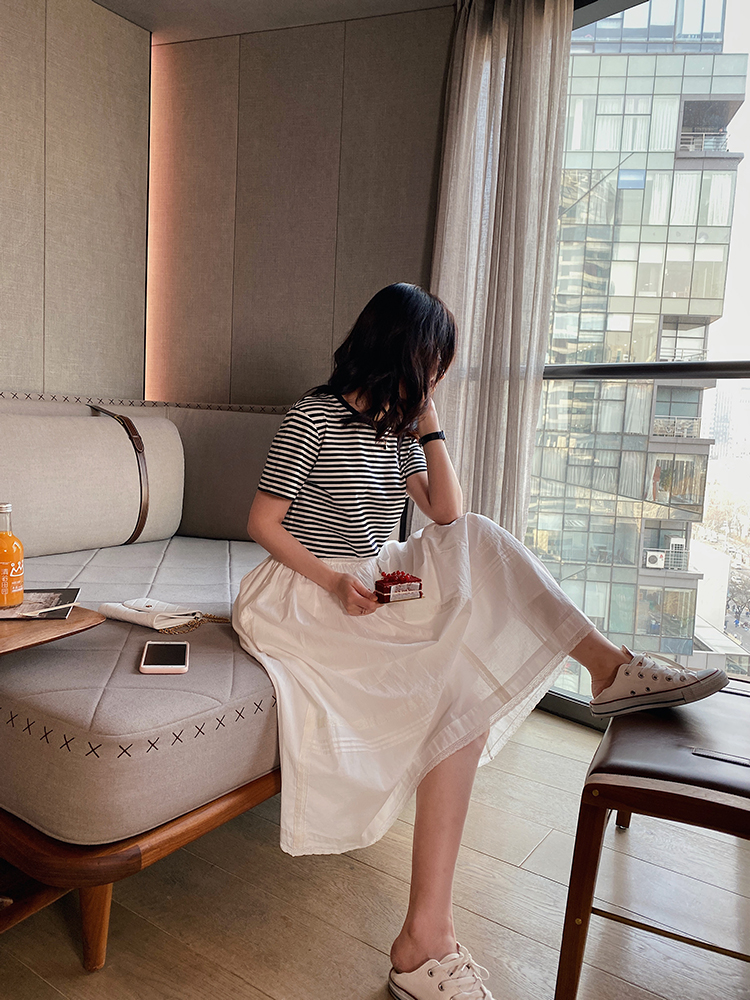 雙層的裙紙。不會(huì)透,放心。 搭配條紋T恤,是很日常的穿搭。 看上去氣質(zhì)很干凈那種。 也可以和本期白上衣成套穿搭, 穿出來(lái)的感覺(jué)會(huì)更仙一些。 這個(gè)牌子的東西一向難得, 就一單,喜歡的不要猶豫。