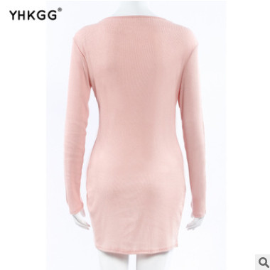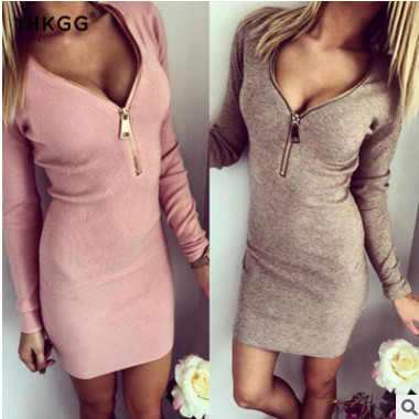 2018歐美秋冬季緊身包臀螺紋v領(lǐng)拉鏈開(kāi)胸保暖長(zhǎng)袖連衣裙