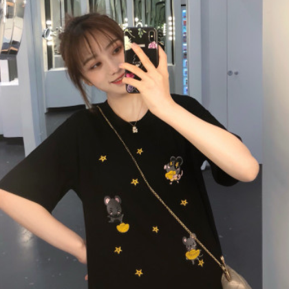 t恤女 2020新款夏季女裝韓版重工刺繡老鼠寬松大碼學生短袖T恤女