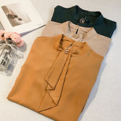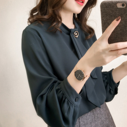 2019春秋裝新款時尚純色寬松燈籠袖雪紡衫女長袖上衣韓范襯衣代發